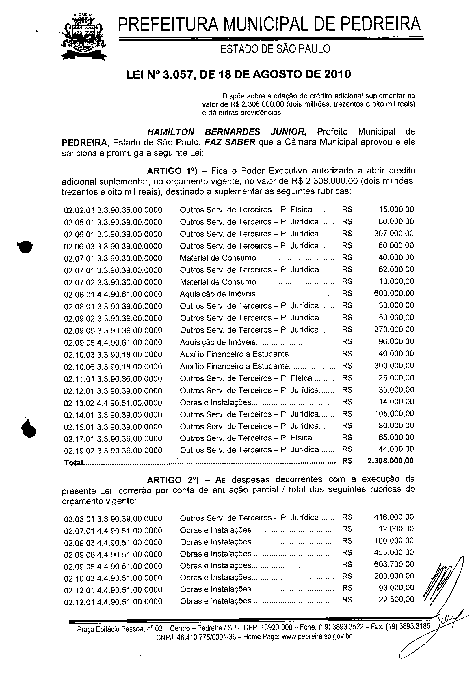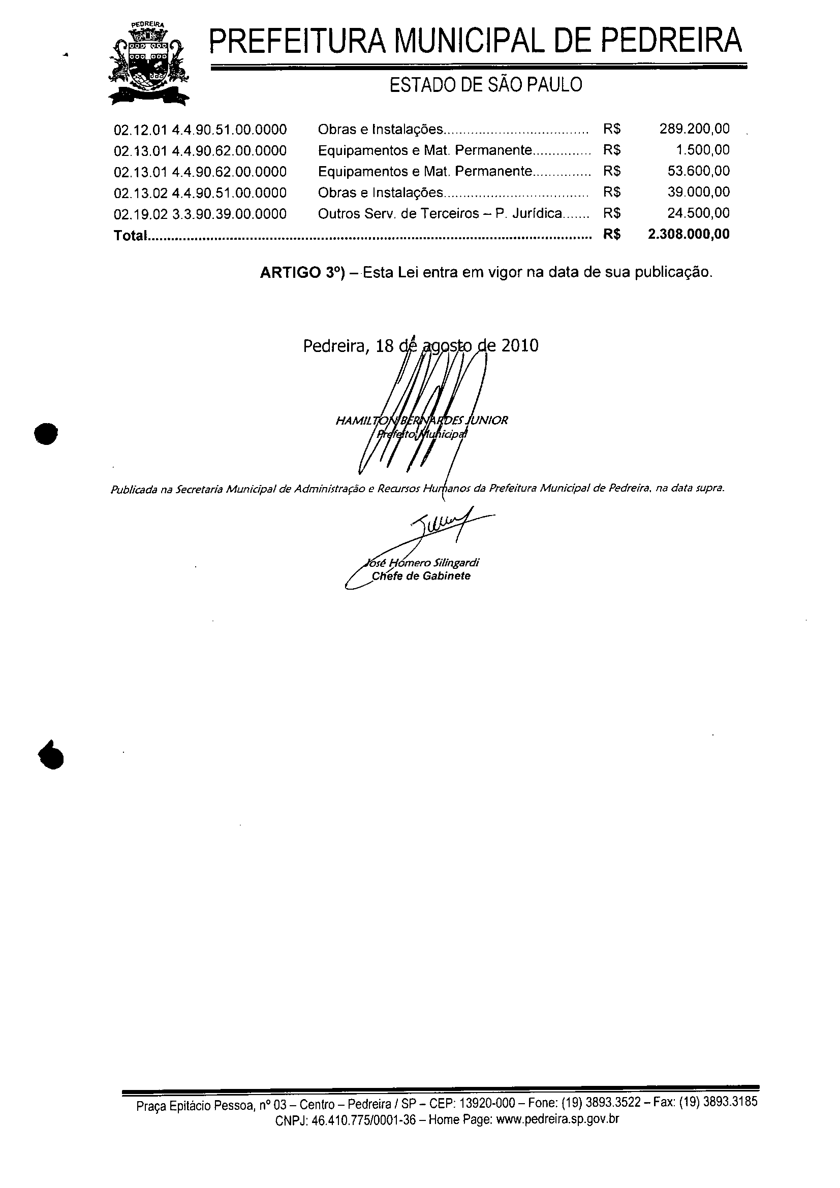 Ementa: Dispõe sobre a criação de crédito adicional suplementar no valor de R$ 2.308.000,00 (dois milhões, trezentos e oito mil reais) e dá outras providências.