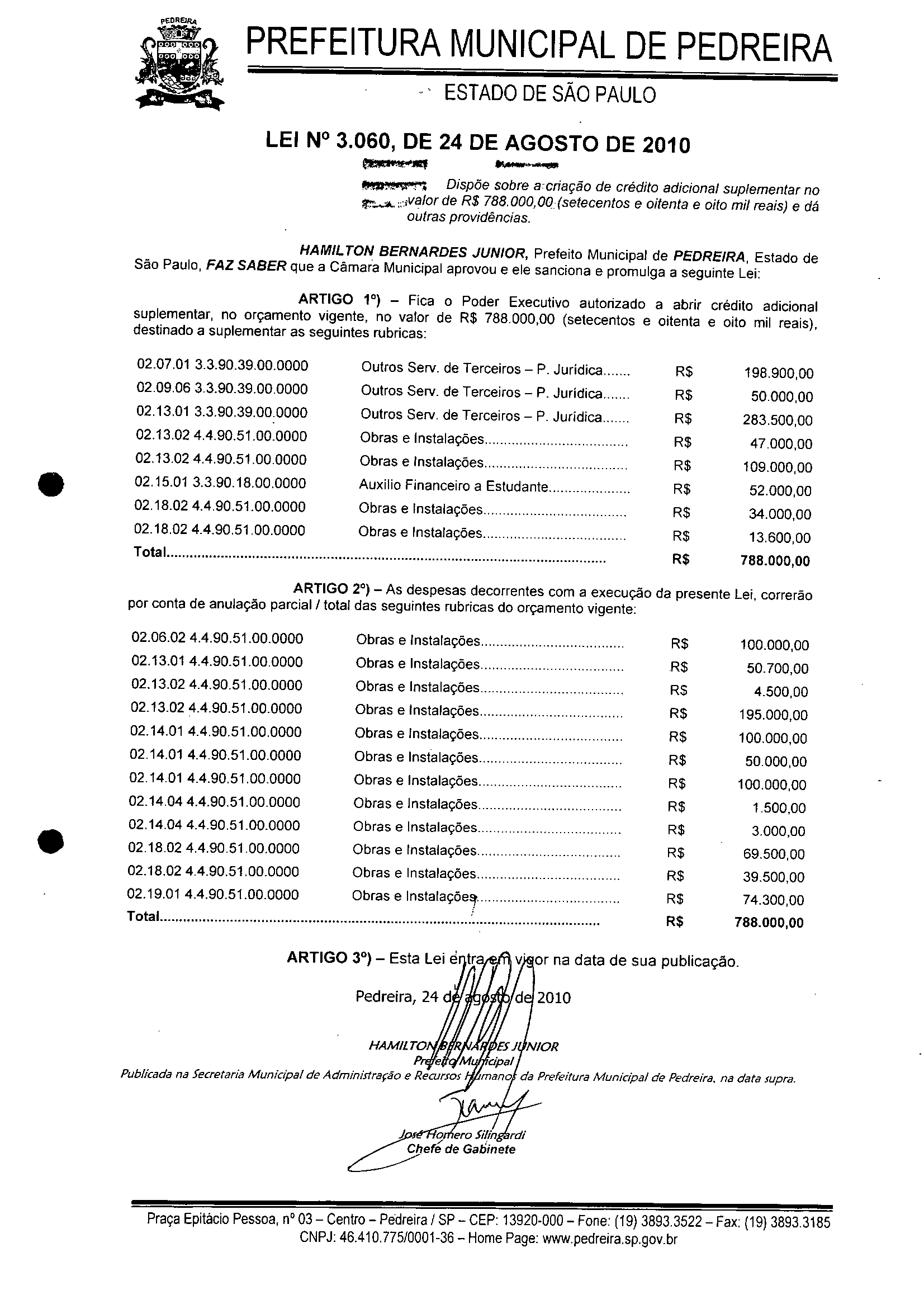 Ementa: Dispõe sobre a criação de crédito adicional suplementar no valor de R$ 788.000,00 (setecentos e oitenta e oito mil reais) e dá outras providências.