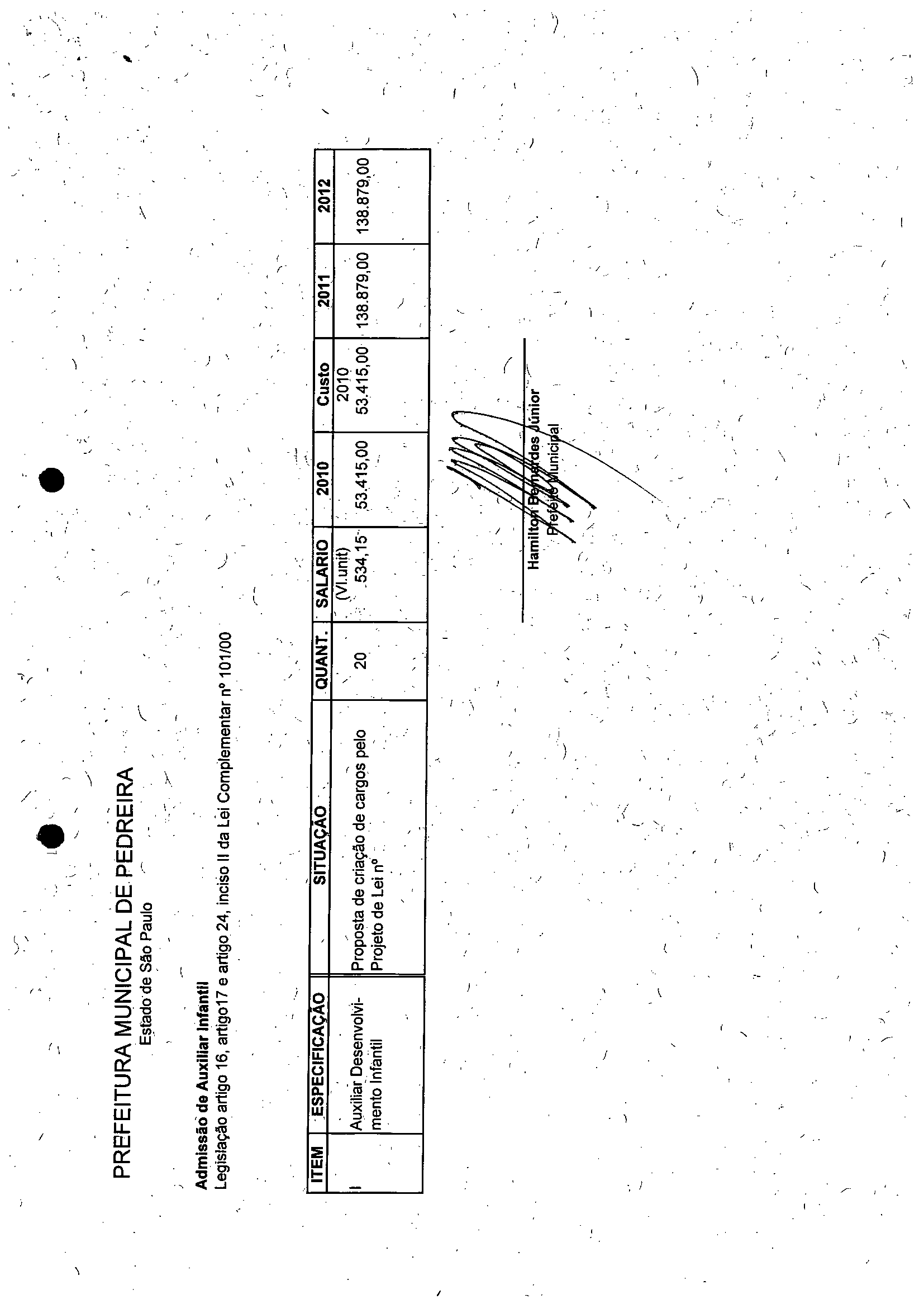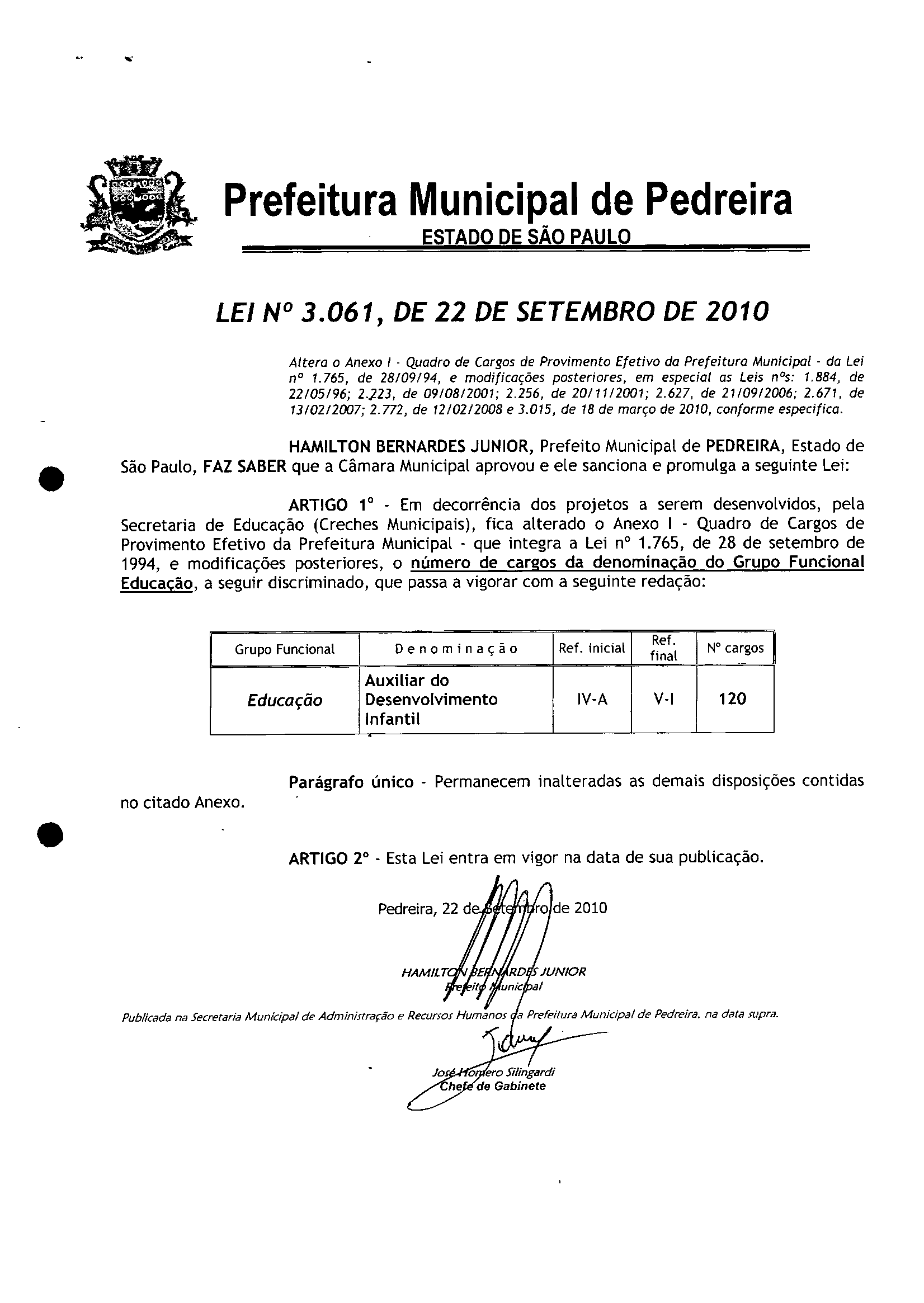 Ementa: Altera o Anexo I -Quadro de Cargos de Provimento Efetivo da Prefeitura Municipal -da Lei n° 1.765, de 28/09194, e modificações posteriores, em especial as Leis nºs: 1.884, de 22/05/96; 2.223, de 09/08/2001; 2.256, de 20/11/2001; 2.627, de 21/09/2006; 2.671, de 13/02/2007; 2.772, de 12/02/2008 e 3.015, de 18 de março de 2010, conforme especifica.