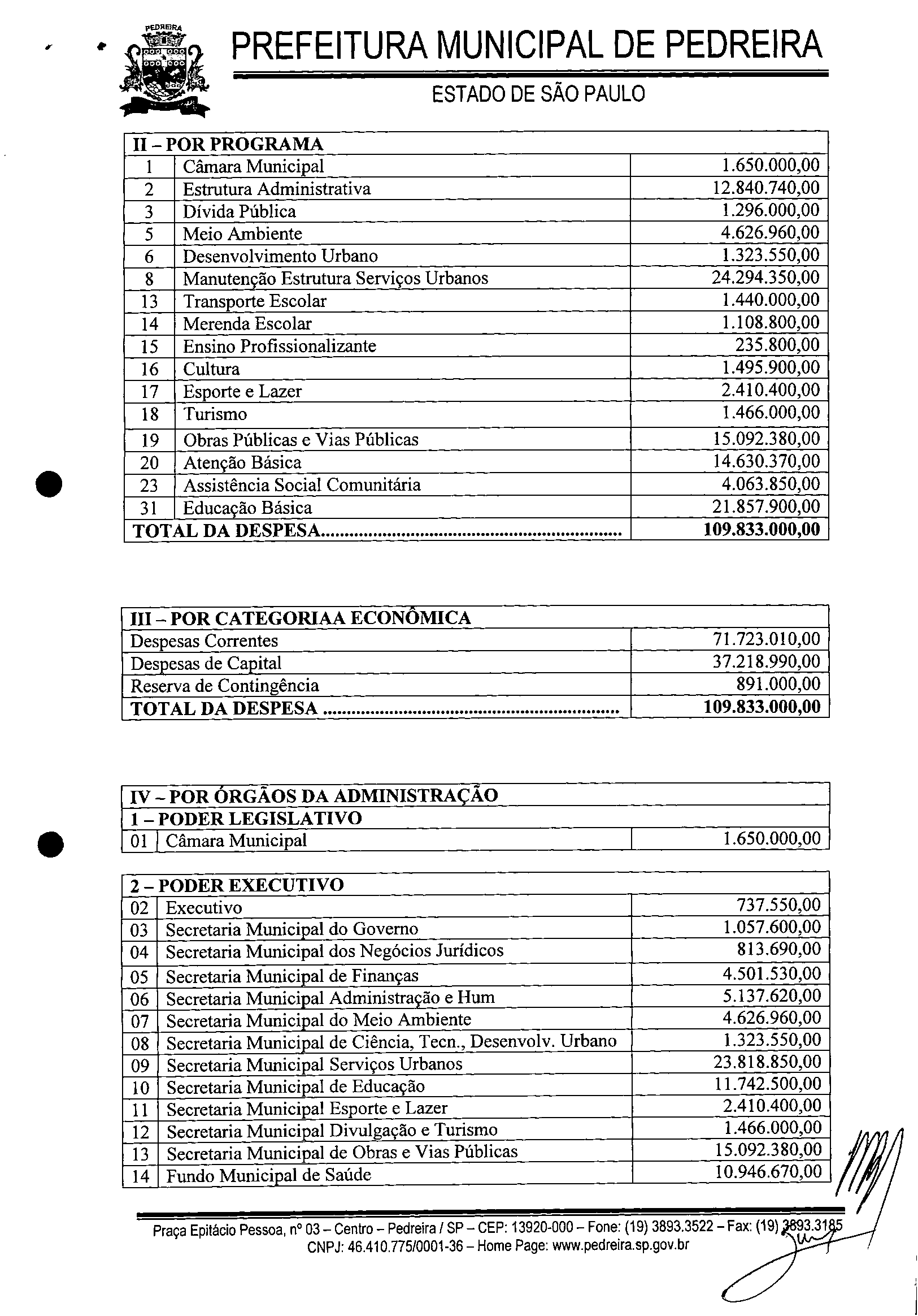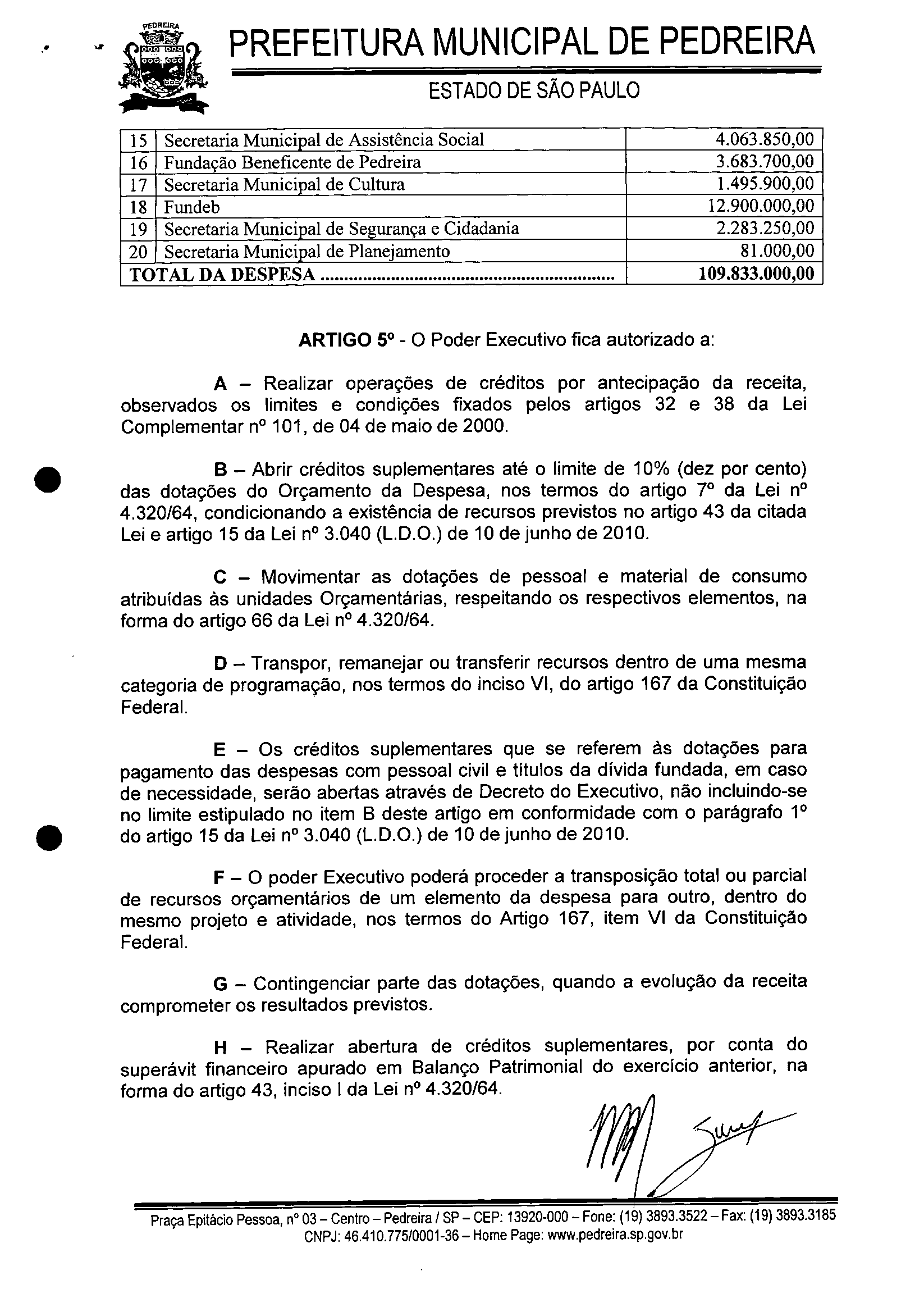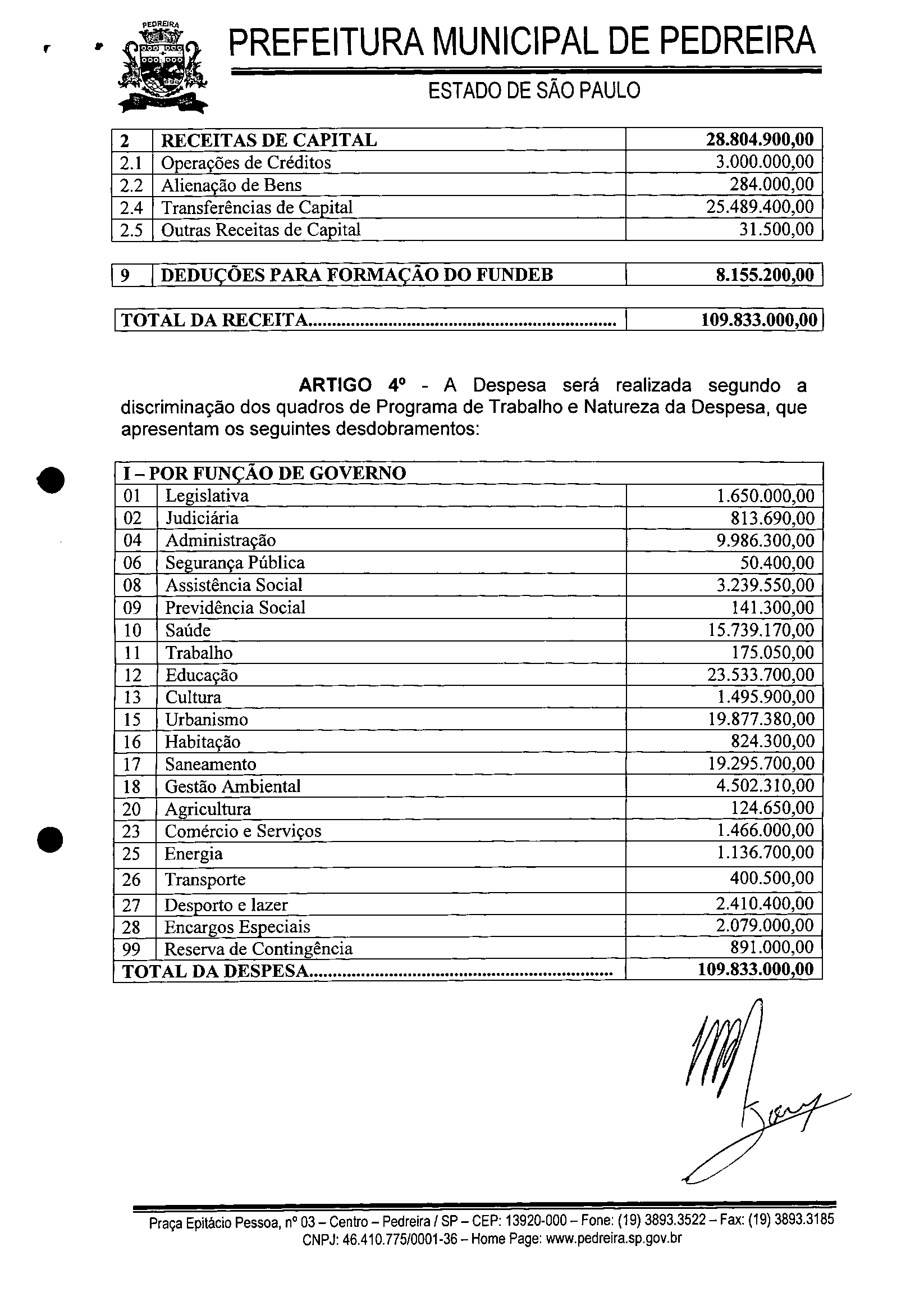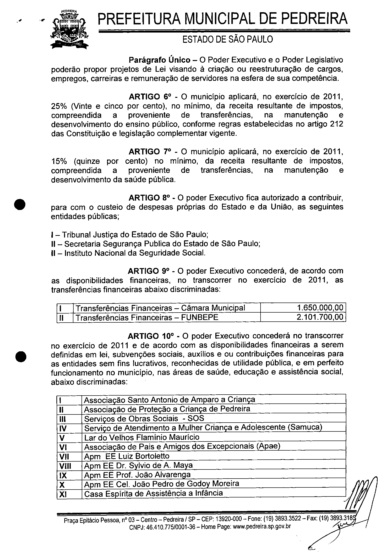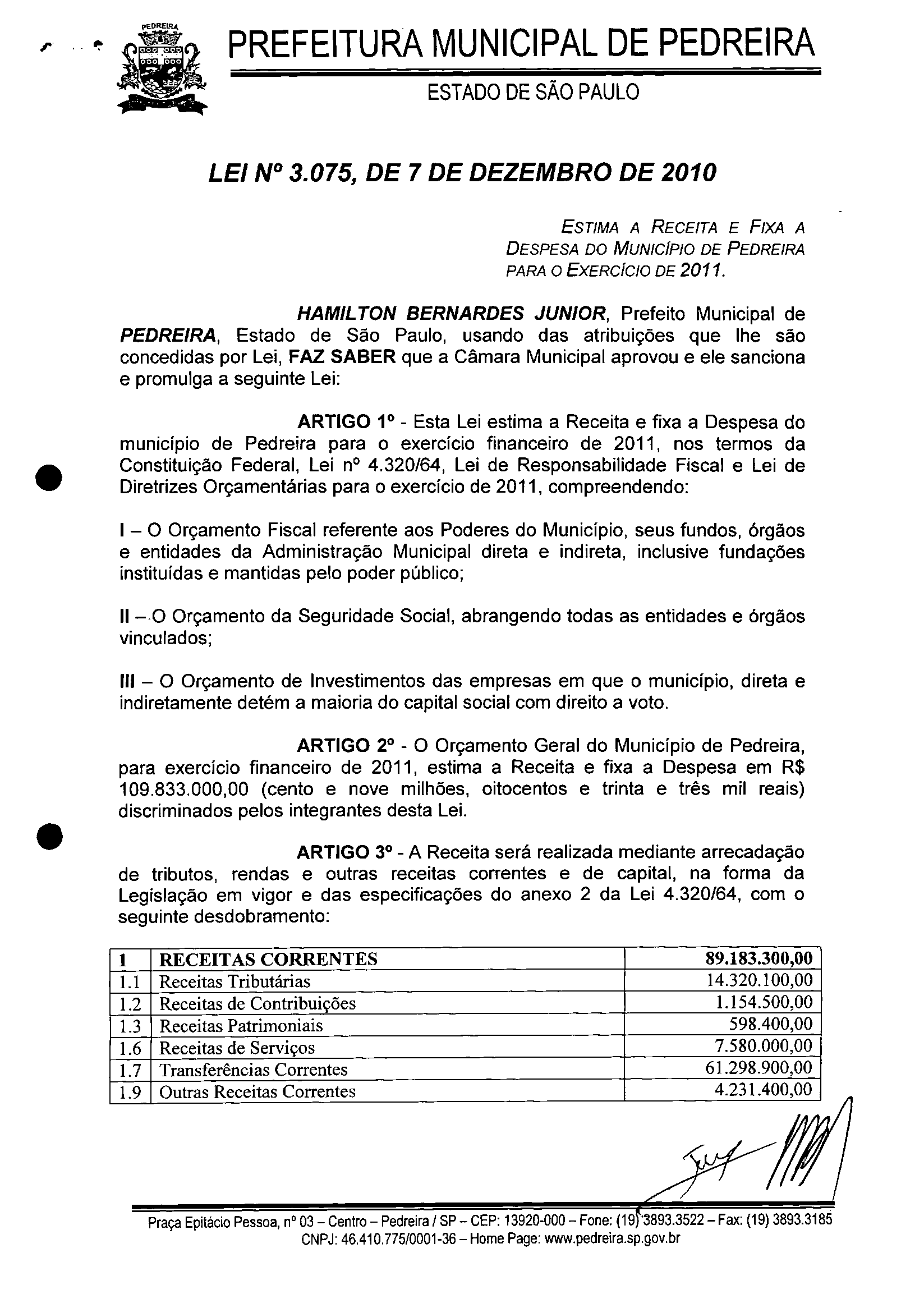 Ementa: ESTIMA A RECEITA E FIXA A DESPESA DO MUNlCIPIO DE PEDREIRA PARA O EXERCICIO DE 2011.