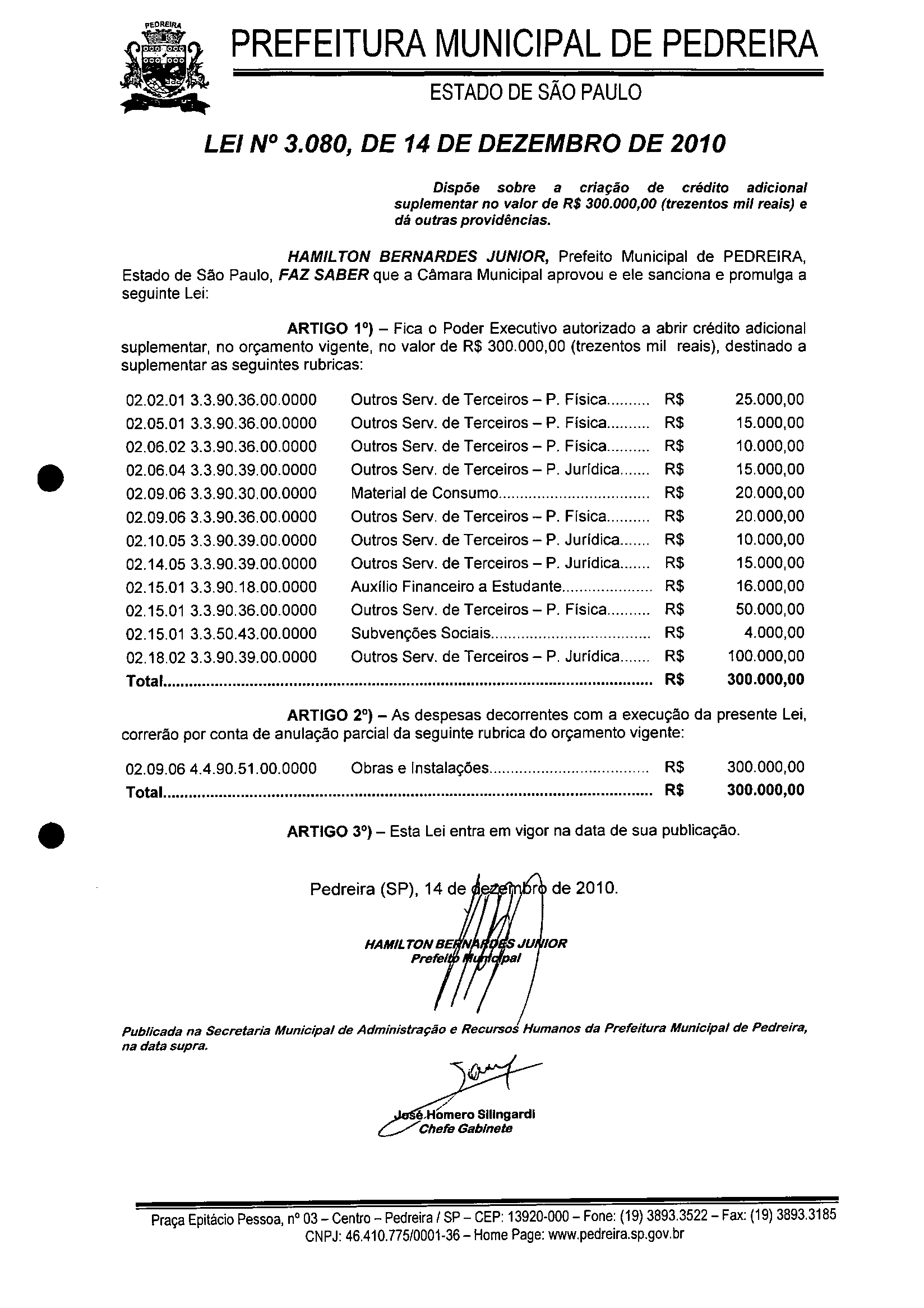 Lei Municipal - N° 3080 de 14/12/2010