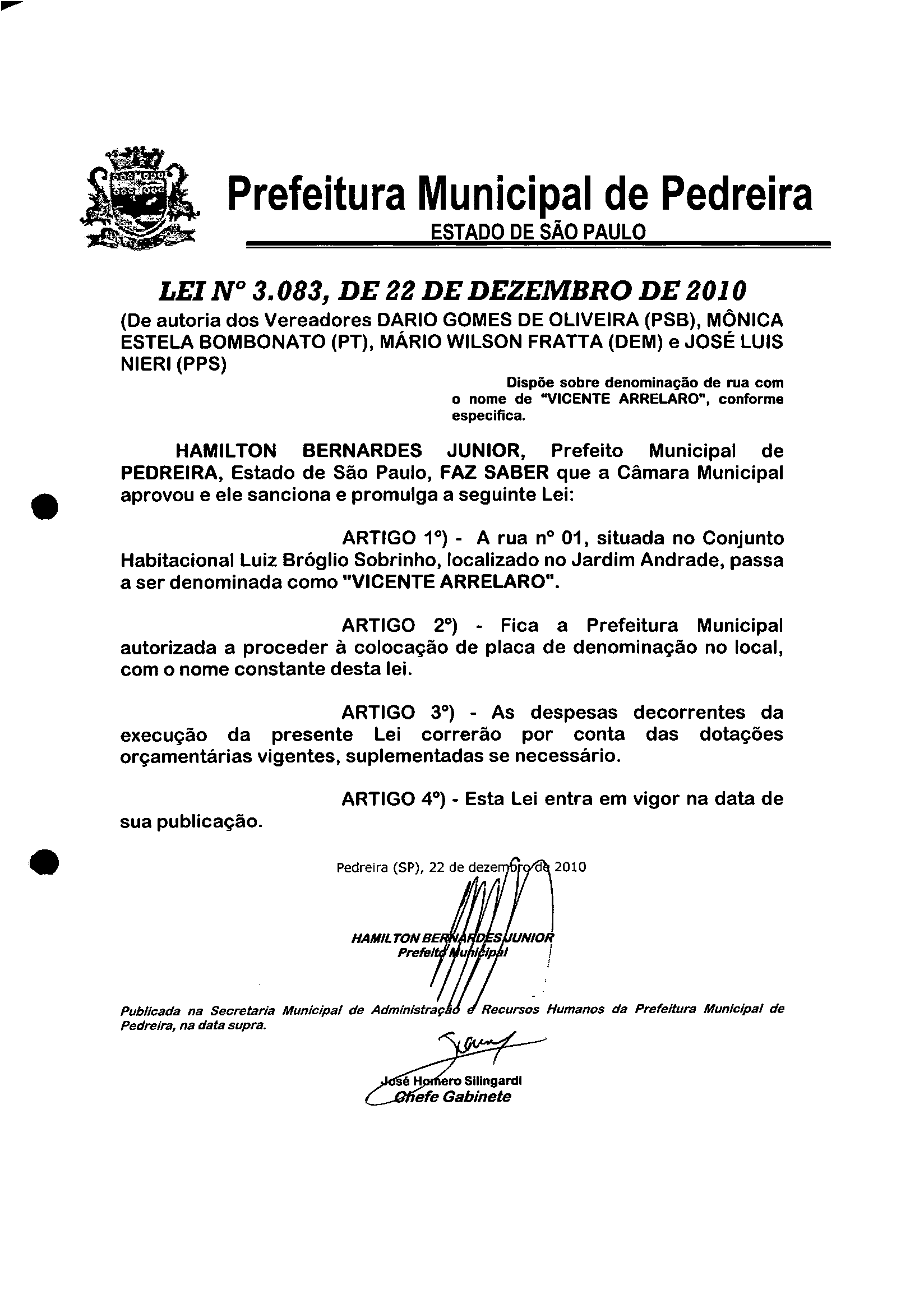 Ementa: Dispõe sobre denominação de rua com o nome de "VICENTE ARRELARO conforme especifica.