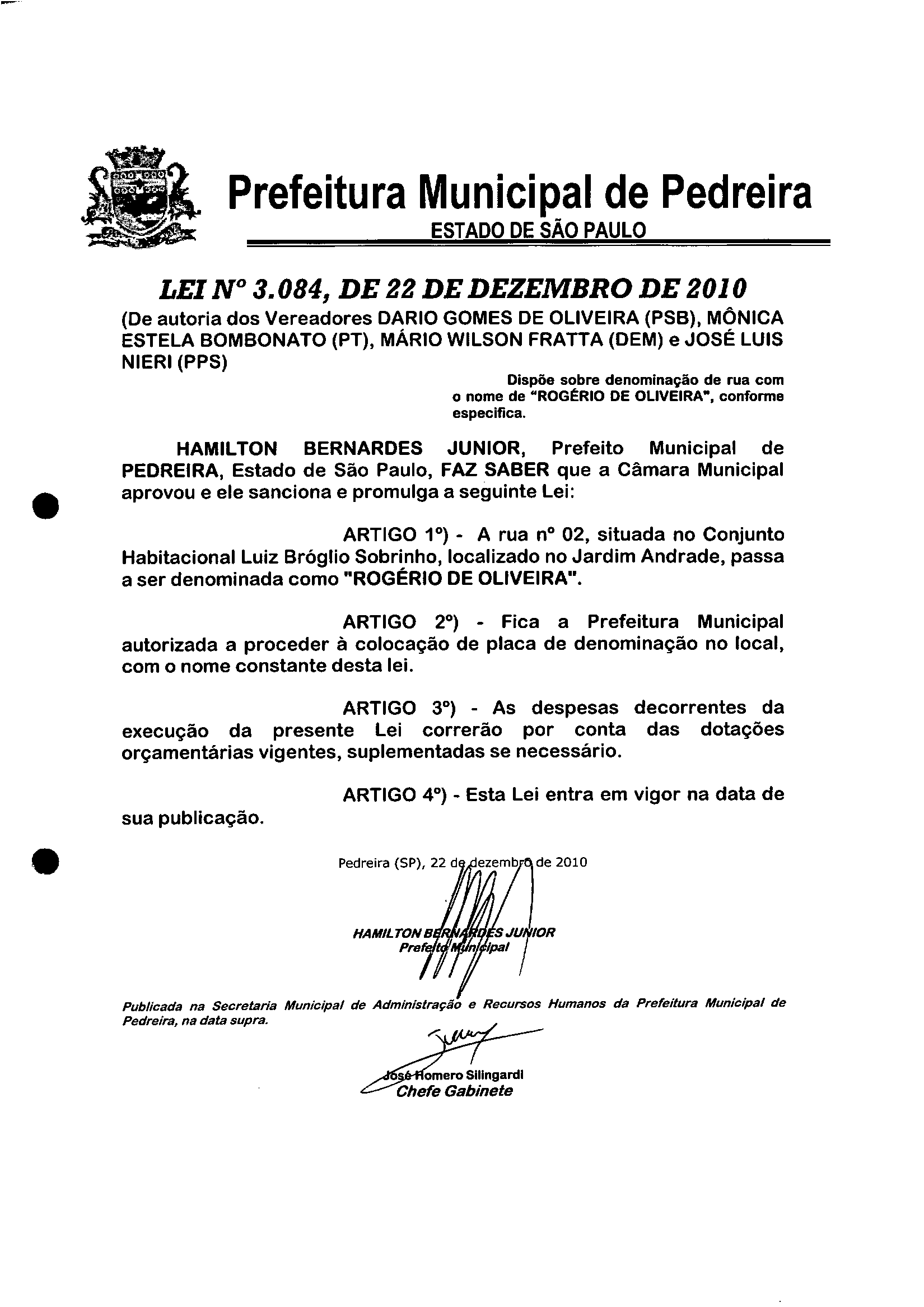 Ementa: Dispõe sobre denominação de rua com o nome de "ROGÉRIO DE OLIVEIRA", conforme especifica.