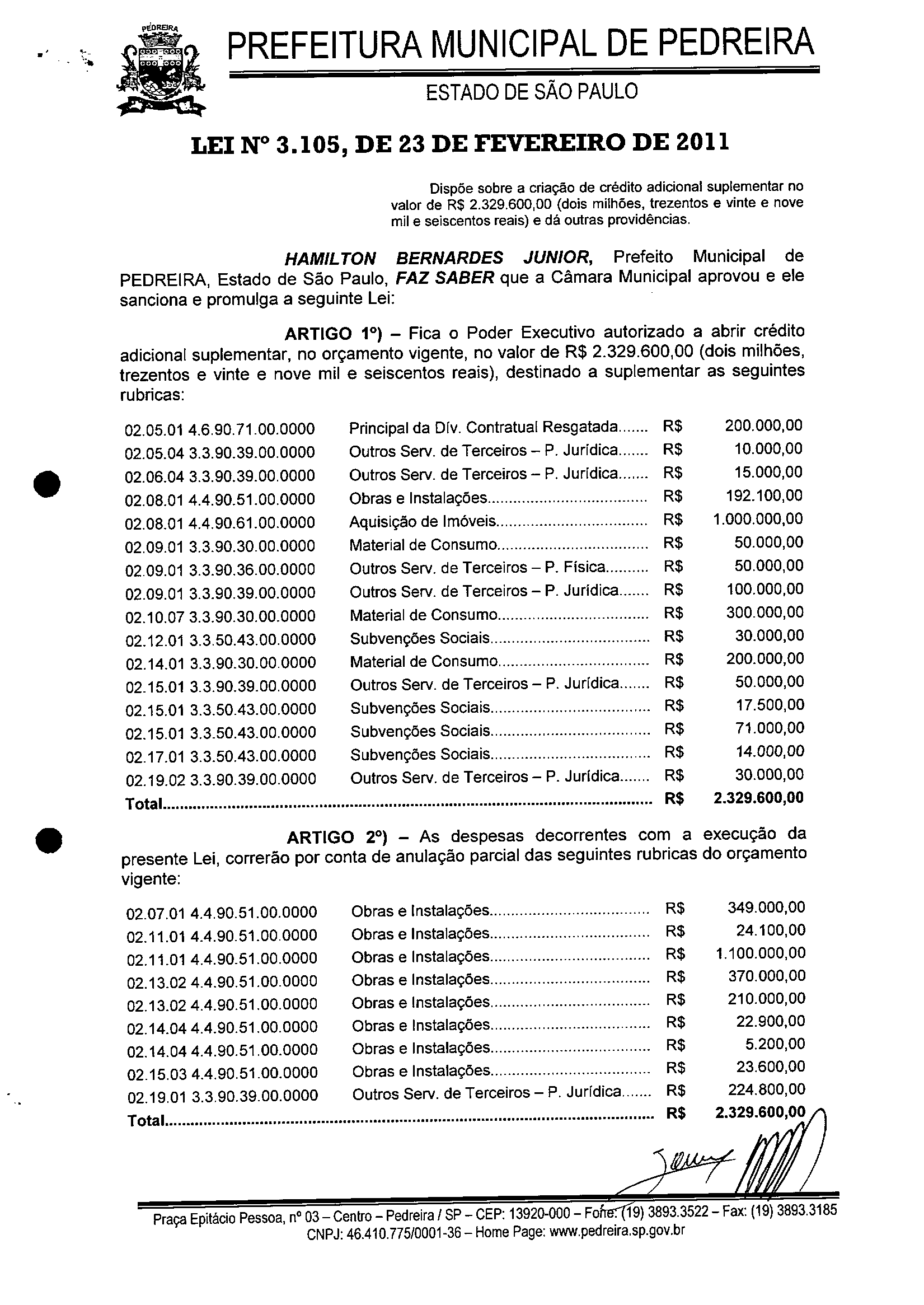 Ementa: Dispõe sobre a criaçao de crédito adicional suplementar no valor de R$ 2.329.600,00 (dois milhões, trezentos e vinte e nove mil e seiscentos reais) e dá outras providências