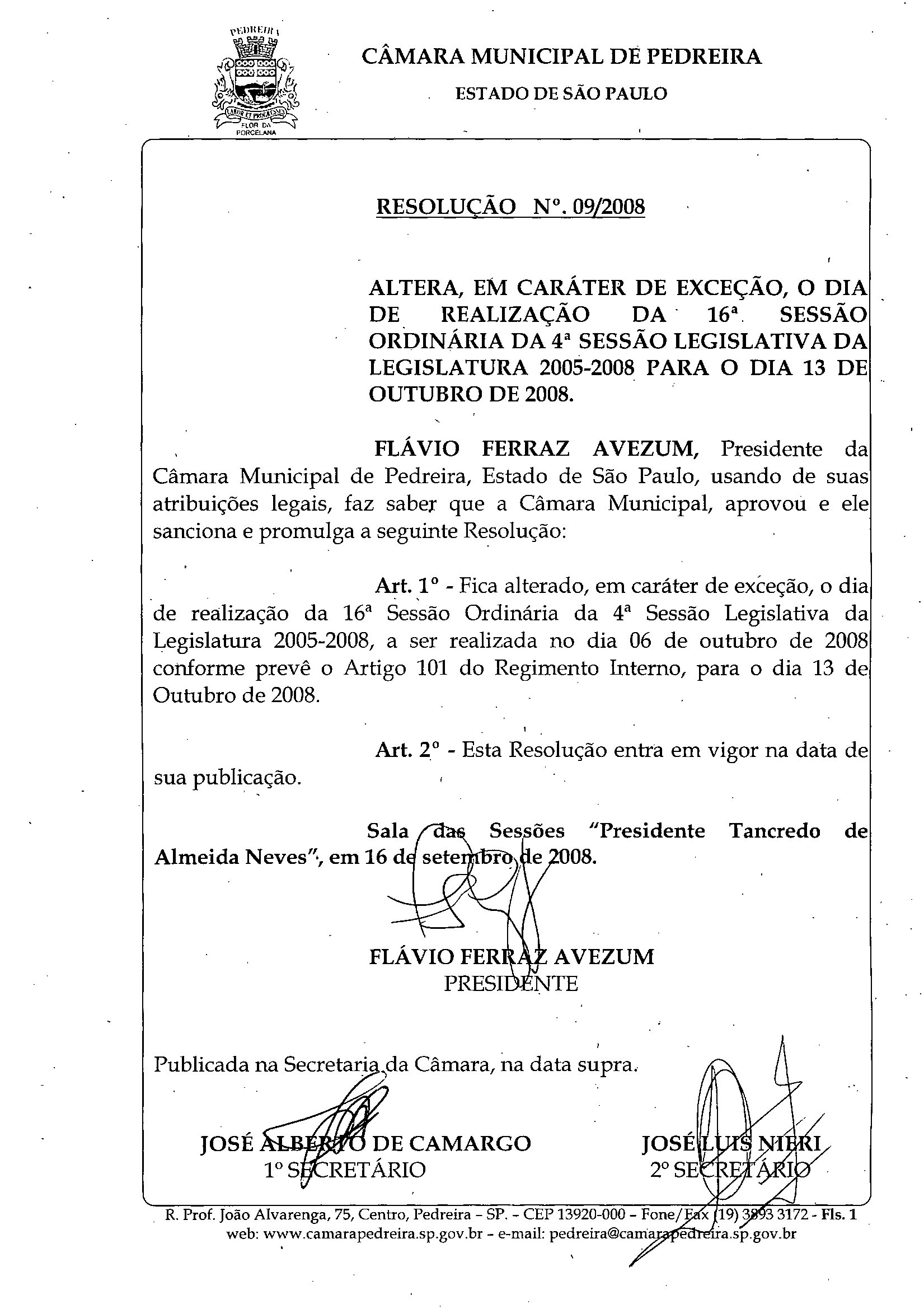 Ementa: ALTERA, EM CARÁTER DE EXCEÇÃO, O DIA DE REALIZAÇAO DA 16ª SESSÃO ORDINÁRIA DA 4ª SESSÃO LEGISLATIVA DA LEGISLATURA 2005-2008 PARA O DIA 13 OUTUBRO DE 2008.