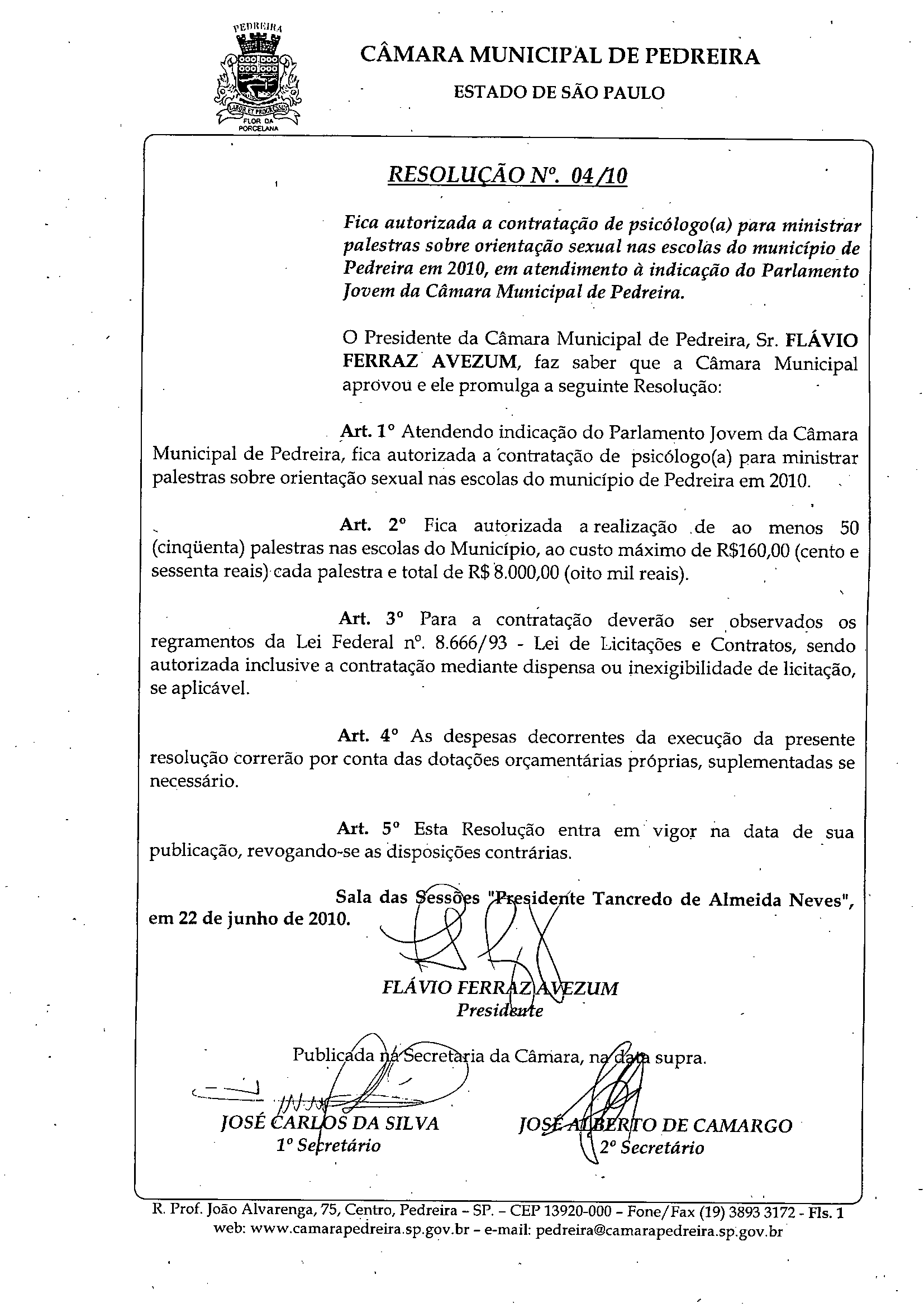 Ementa: Fica autorizada a contratação de psicólogo(a) para ministrar palestras sobre orientação sexual nas escolas do município de Pedreira em 2010, em atendimento à indicação do Parlamento Jovem da Câmara Municipal de Pedreira.