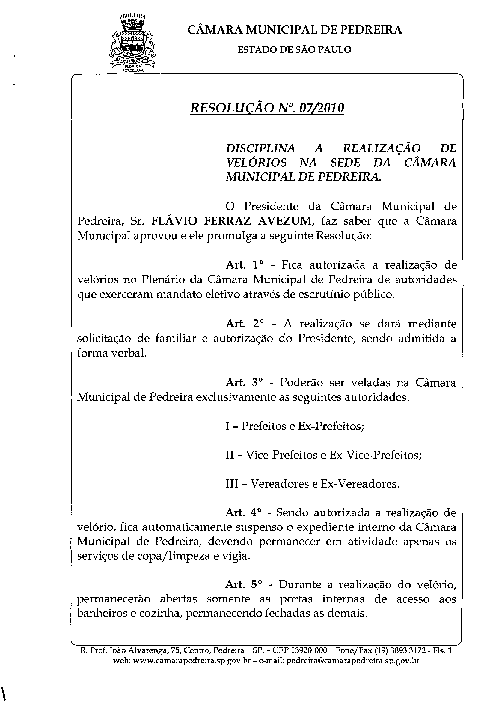 Ementa: DISCIPLINA A REALIZAÇAO DE VELÓRIOS NA SEDE DA CÂMARA MUNICIPAL DE PEDREIRA.