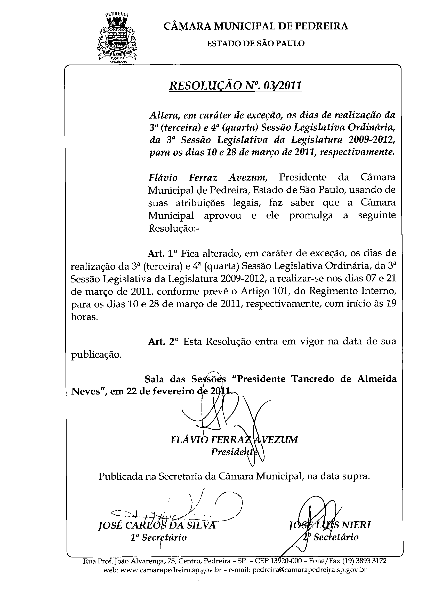 Ementa: Altera, em caráter de exceção, os dias de realização da 3a (terceira) e 4a (quarta) Sessão Legislativa Ordinária, da 3a Sessão Legislativa da Legislatura 2009-2012, para os dias 10 e 28 de março de 2011, respectivamente.