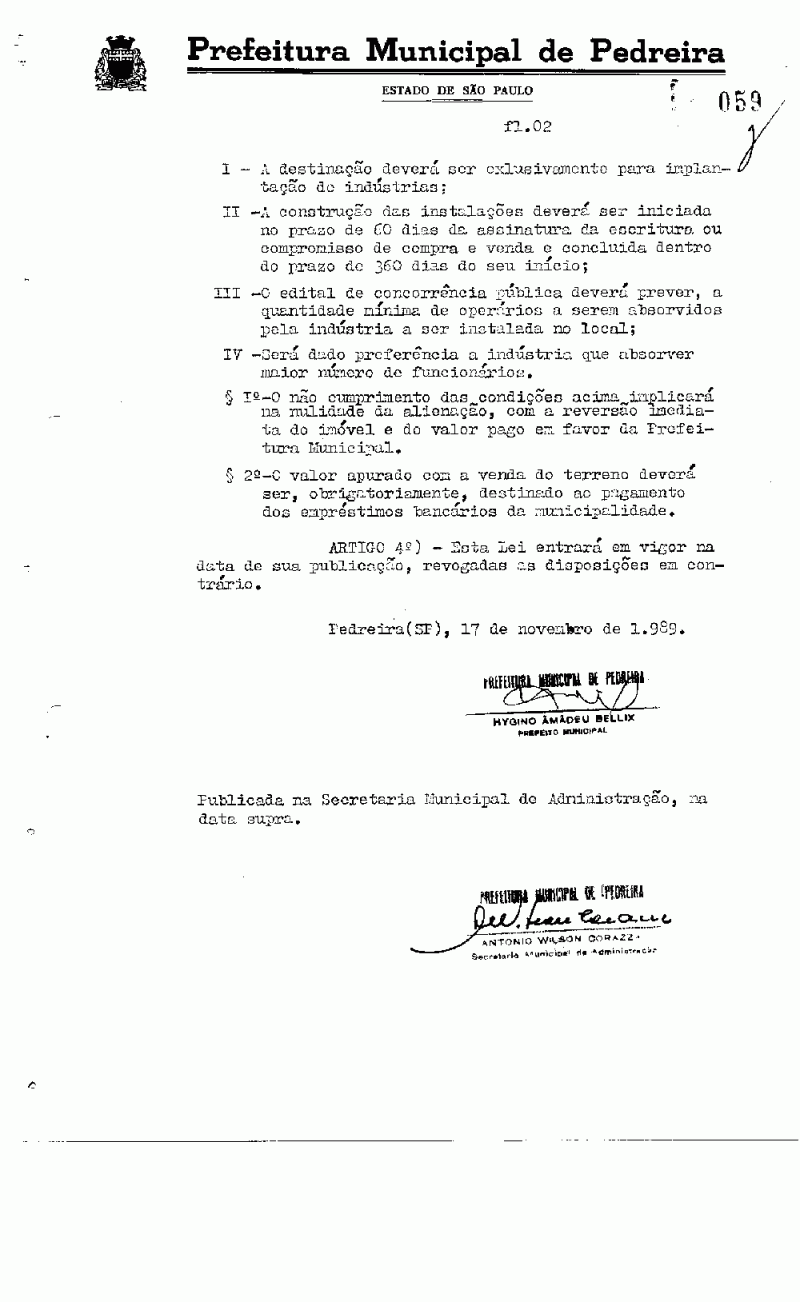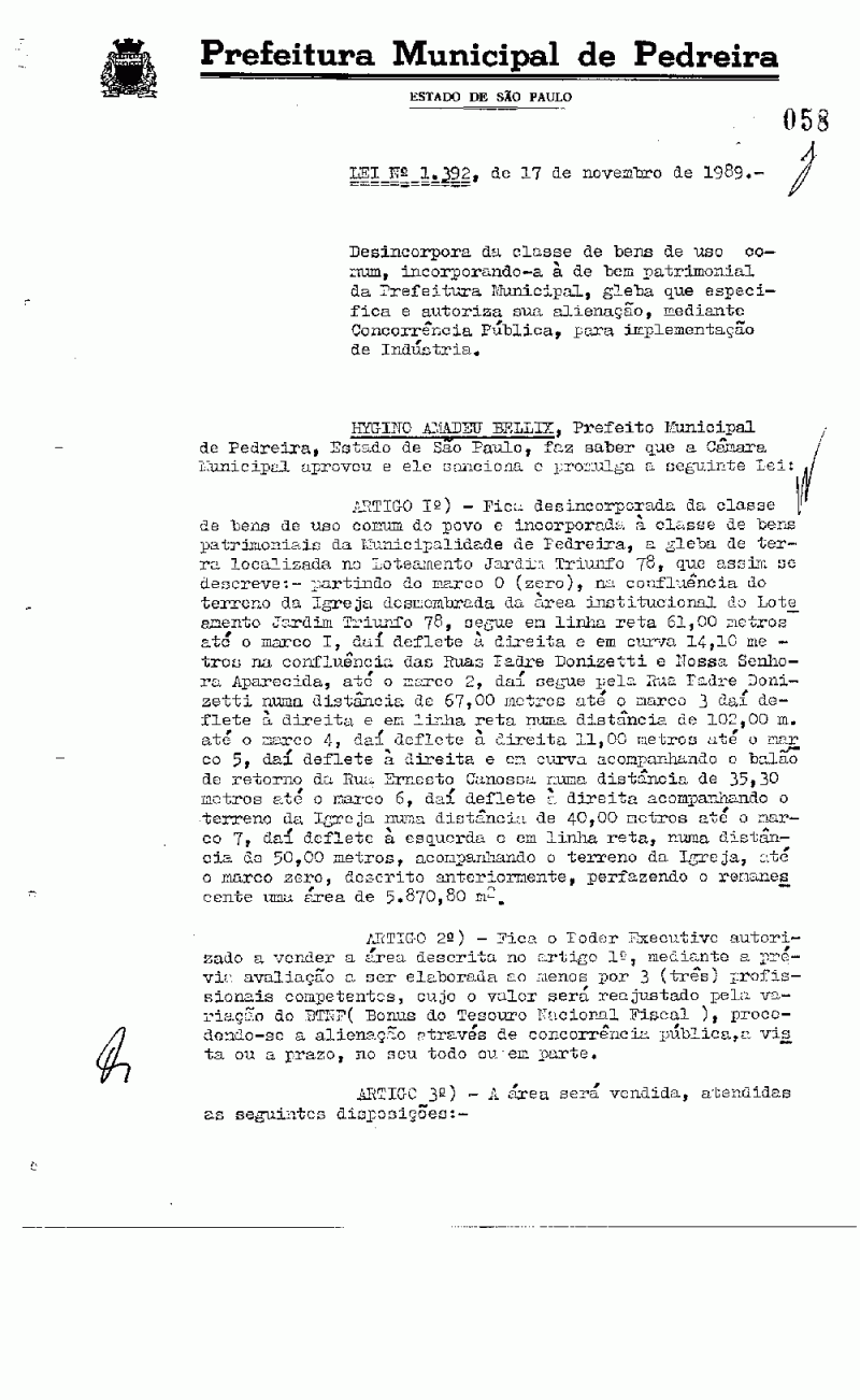 Ementa: Desincorpora da classe de bens de uso comum, incorporando-a à de bem patrimonial da Prefeitura Municipal, gleba que especifica e autoriza sua alienação, mediante Concorrência Pública, para implementação de Indústria.