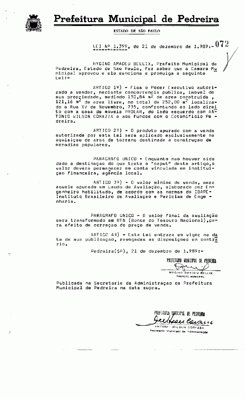 Lei Municipal - N° 1399 de 21/12/1989