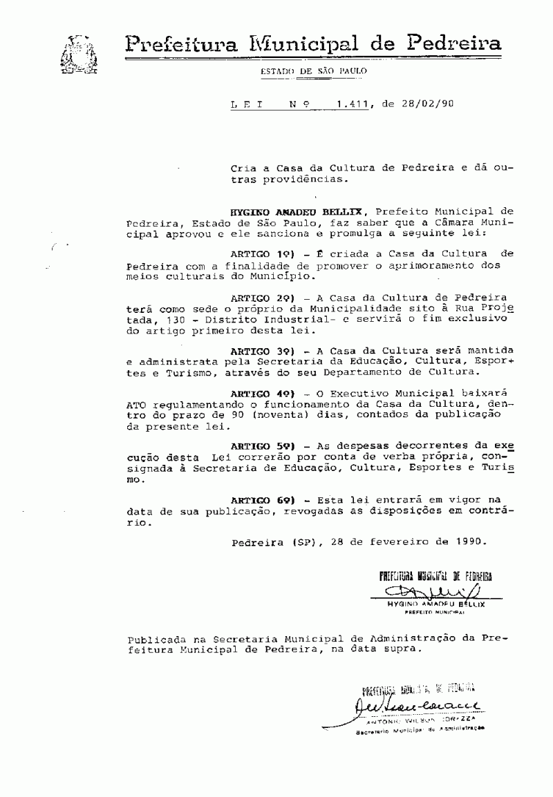 Ementa: Cria a Casa da Cultura de Pedreira e dá outras providências.