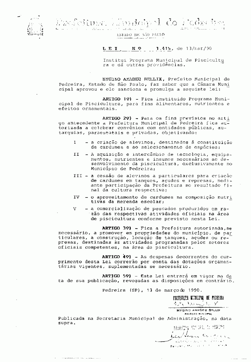 Ementa: Institui Programa Municipal de Piscicultura e dá outras providências.