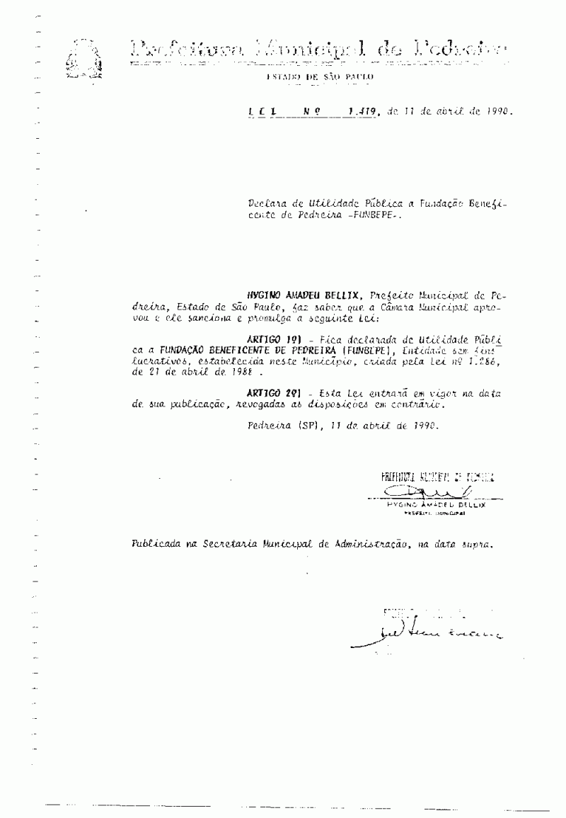 Ementa: Declara de utilidade pública a Fundação Beneficente de Pedreira - FUNBEPE.