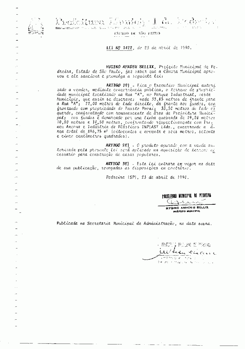 Ementa: Artigo 1º - Fica o Executivo Municipal autorizado a vender, mediante concorrência pública, o terreno de propriedade municipal localizado na Rua "A", no Parque Industrial, neste Município, que assim se descreve.
