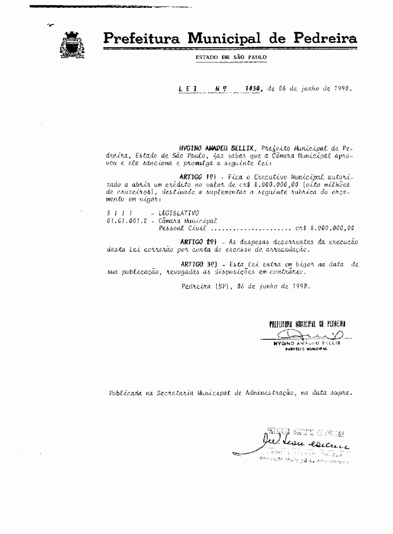 Ementa: Artigo 1º - Fica o Executivo Municipal autorizado a abrir um crédito no valor de Cr$ 8.000.000,00 (oito milhões de cruzeiros), destinado a suplementar a seguinte rubrica do orçamento.