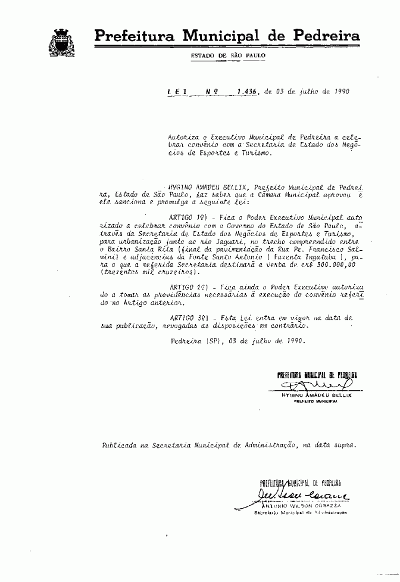Ementa: Autoriza o Executivo Municipal de Pedreira a celebrar convênio com a Secretaria de Estado dos Negócios de Esportes e Turismo.