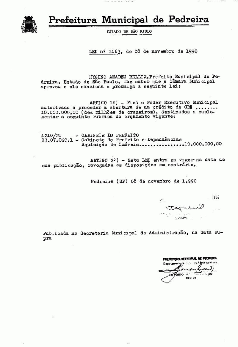 Ementa: Artigo 1º - Fica o Poder Executivo Municipal autorizado a proceder a abertura de um crédito de Cr$ 10.000.000,00 (dez milhões de cruzeiros), destinados a suplementar a seguinte rubrica do orçamento vigente.