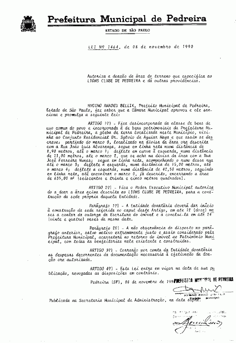 Ementa: Autoriza a doação de área de terreno que especifica ao Lions Clube de Pedreira e dá outras providências.
