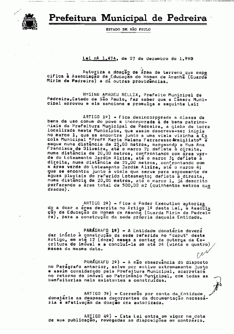 Ementa: Autoriza a doação de área de terreno que especifica à Associação de Educação do Homem de Amanhã (Guarda Mirim de Pedreira) e dá outras providências.