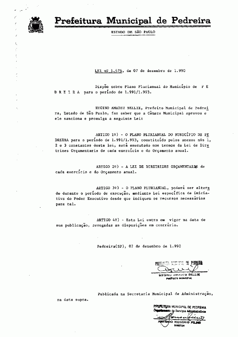 Ementa: Dispõe sobre Plano Plurianual do Município de Pedreira para o período de 1991/1993.