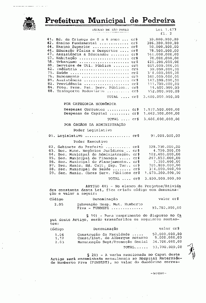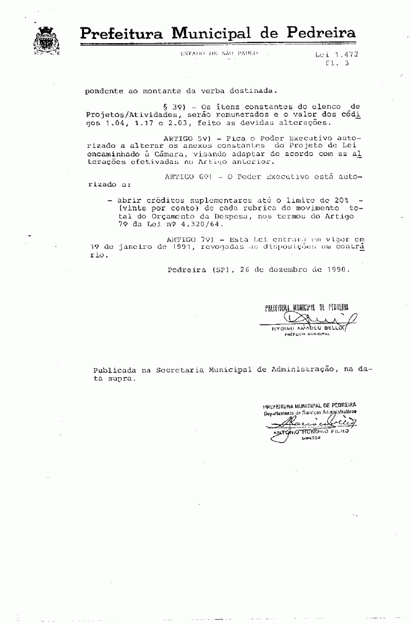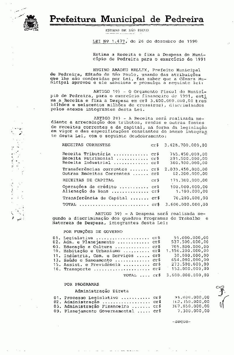 Ementa: Estima e receita e fixa a Despesa do Municipio de pedreira para o exercício de 1991