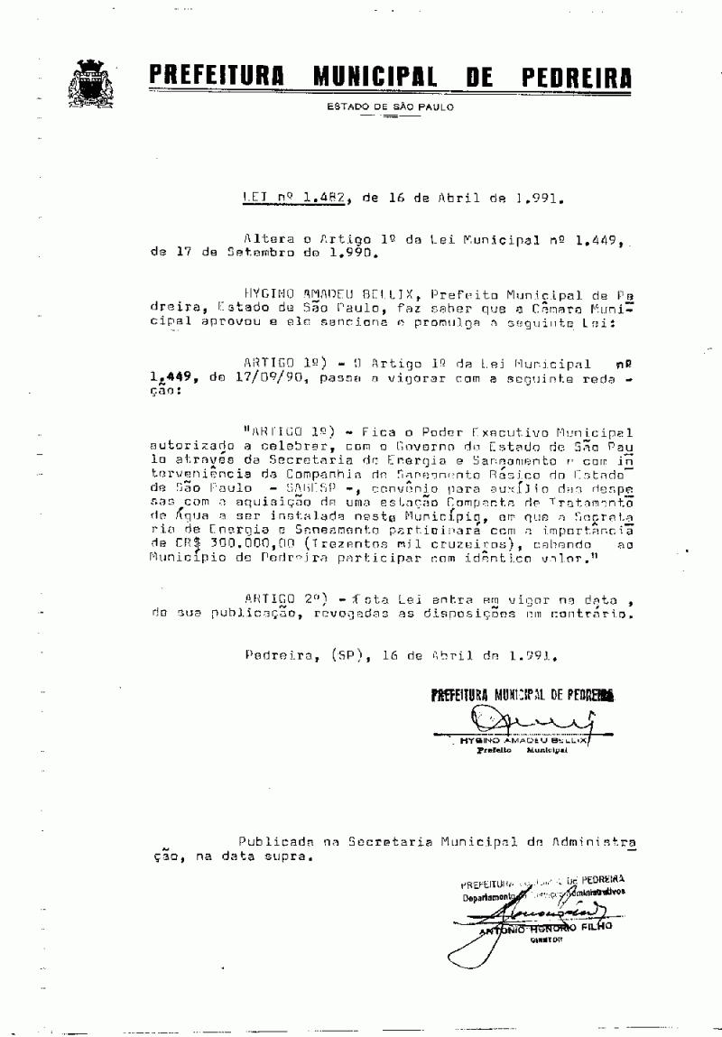 Lei Municipal - N° 1482 de 16/04/1991