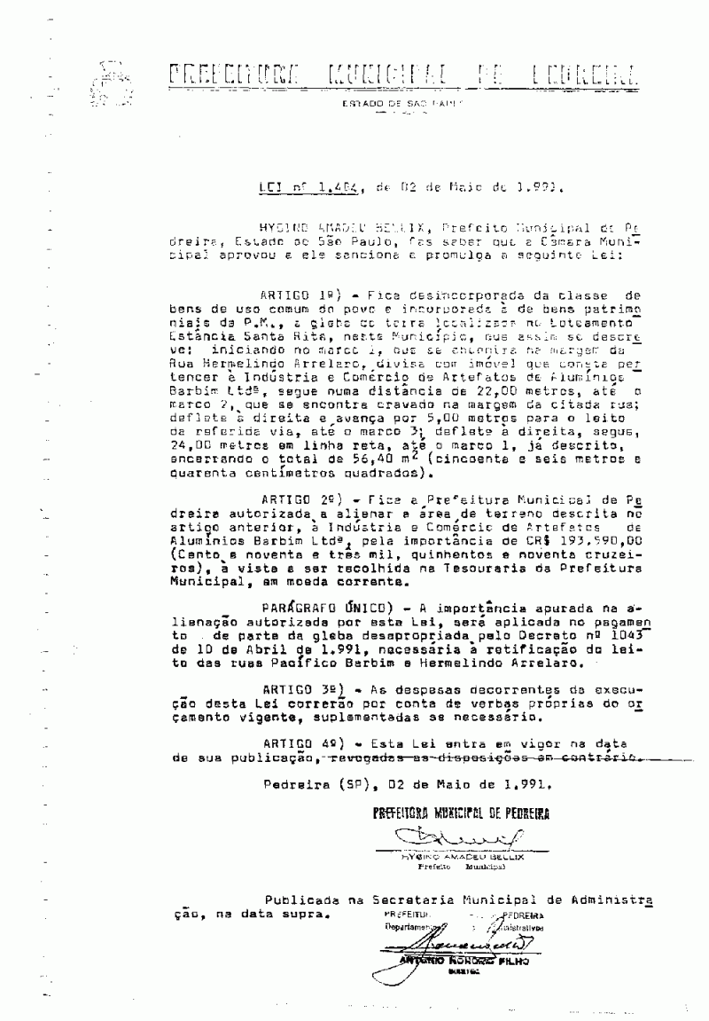 Lei Municipal - N° 1484 de 02/05/1991