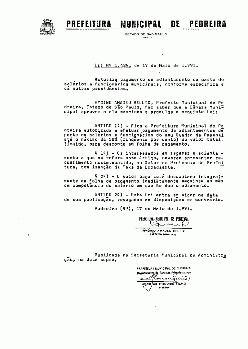 Ementa: Autoriza pagamento de adiantamento de parte de salários a funcionários, conforme especifica e dá outras providências.