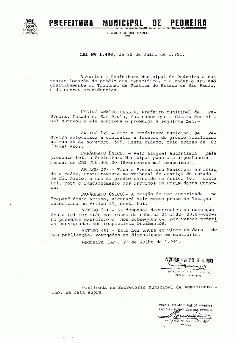 Ementa: Autoriza a Prefeitura Municipal de Pedreira a contratar locação de prédio que especifica, e a ceder o seu uso gratuitamente ao Tribunal de Justiça do Estado de São Paulo, e dá outras providências.