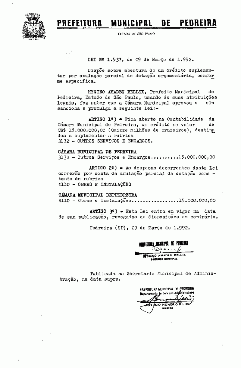 Lei Municipal - N° 1537 de 09/03/1992