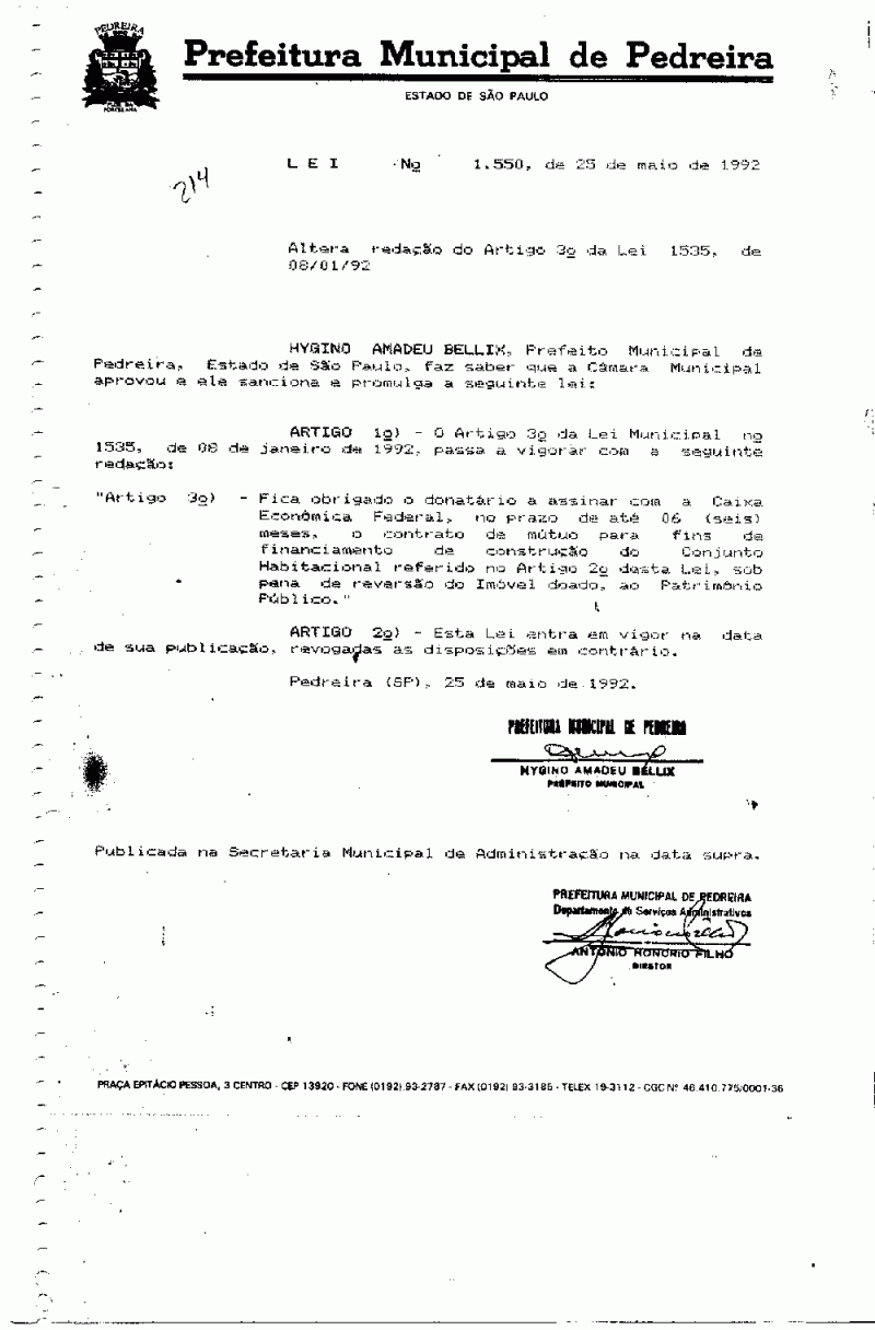 Lei Municipal - N° 1550 de 25/05/1992