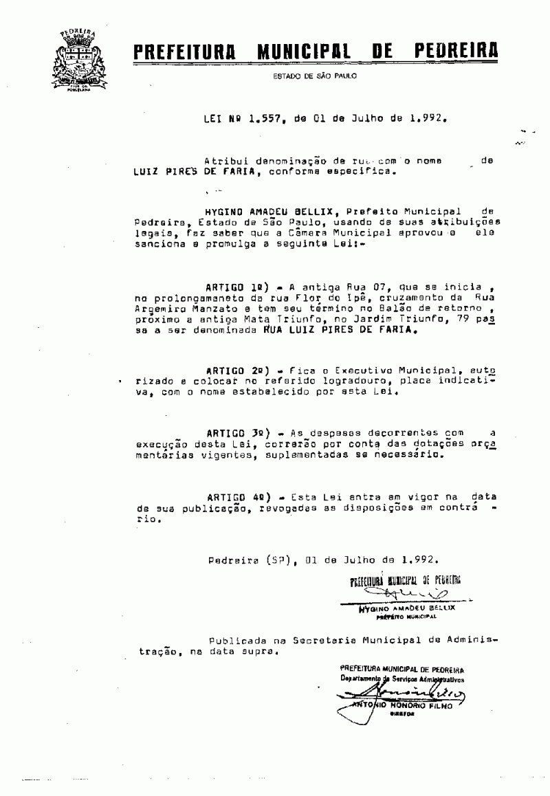 Lei Municipal - N° 1557 de 01/07/1992