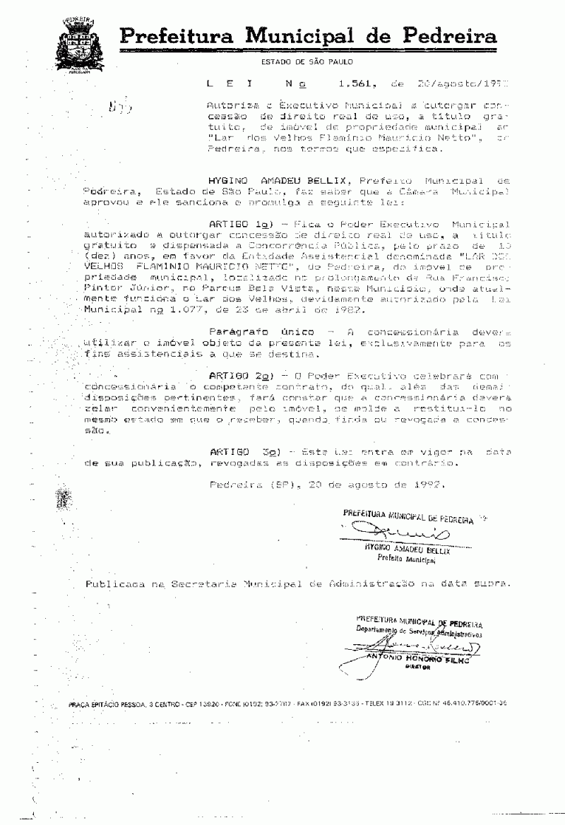Lei Municipal - N° 1561 de 20/08/1992