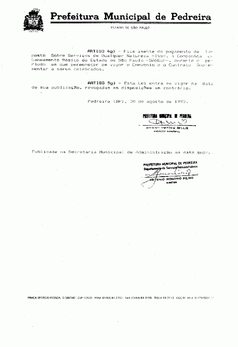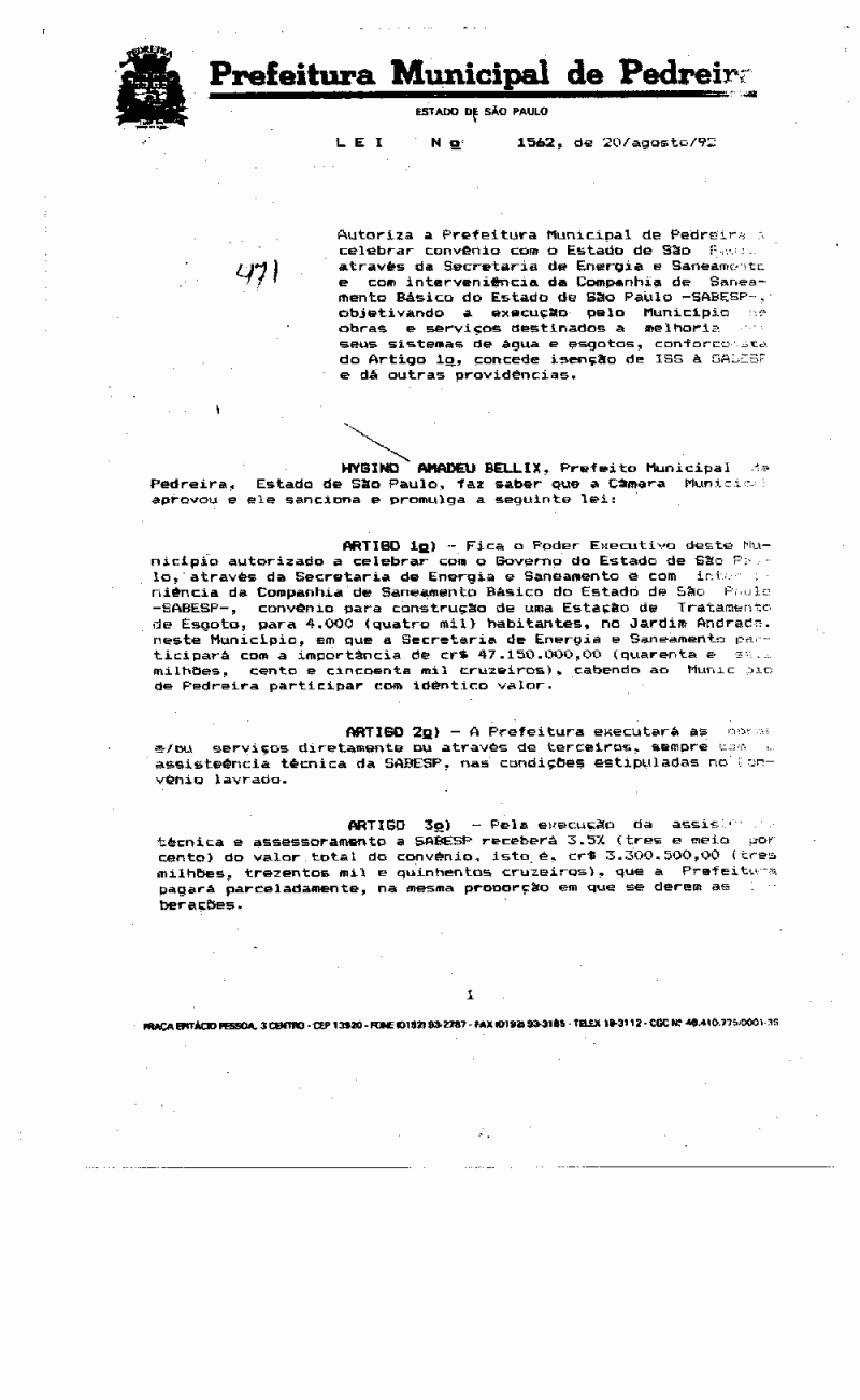 Ementa: Autoriza a Prefeitura Municipal de Pedreira à celebrar convênio com o Estado de São Paulo, através da Secretaria de Energia e Saneamento e com interveniência da Companhia de Saneamento Básico do Estado de São Paulo - SABESP -, objetivando a execução pelo Município de obras e serviços destinados a melhoria de seus sistemas de água e esgotos, conforme consta do Artigo 1º, concede isenção de ISS à SABESP e dá outras providências.