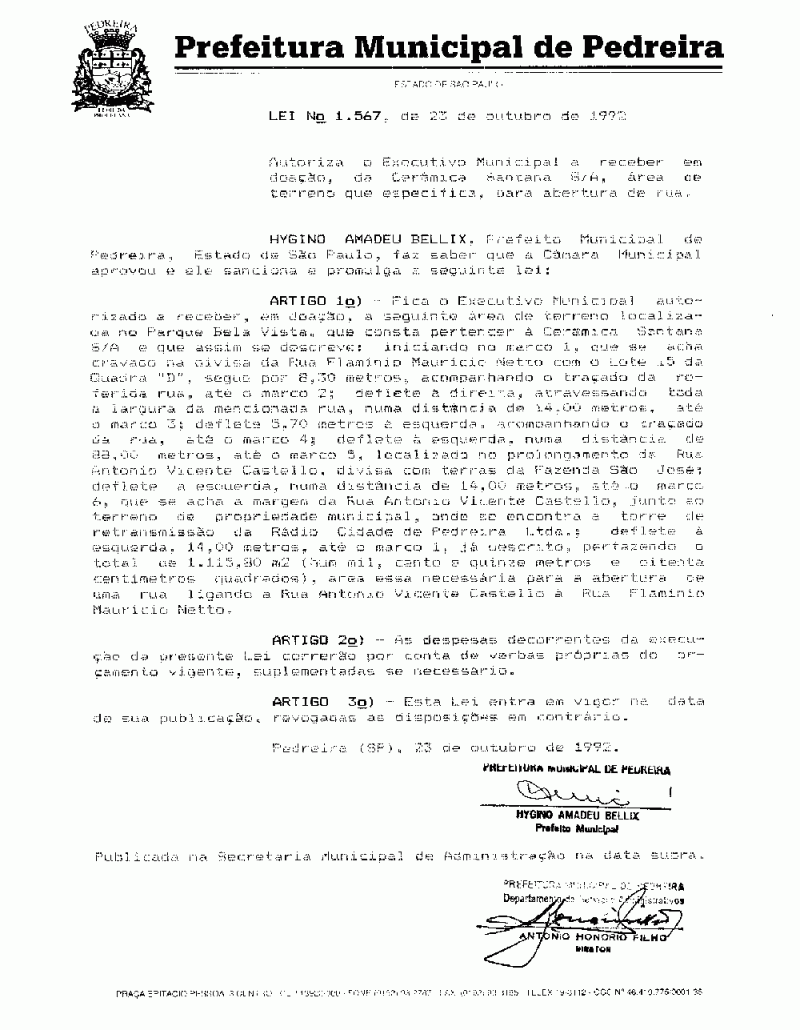 Ementa: Autoriza o Executivo Municipal a receber em doação, da Cerâmica Santana S/A, área de terreno que especifica, para abertura de rua.