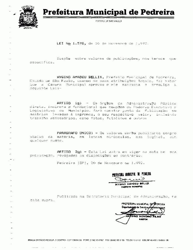 Lei Municipal - N° 1578 de 20/11/1992