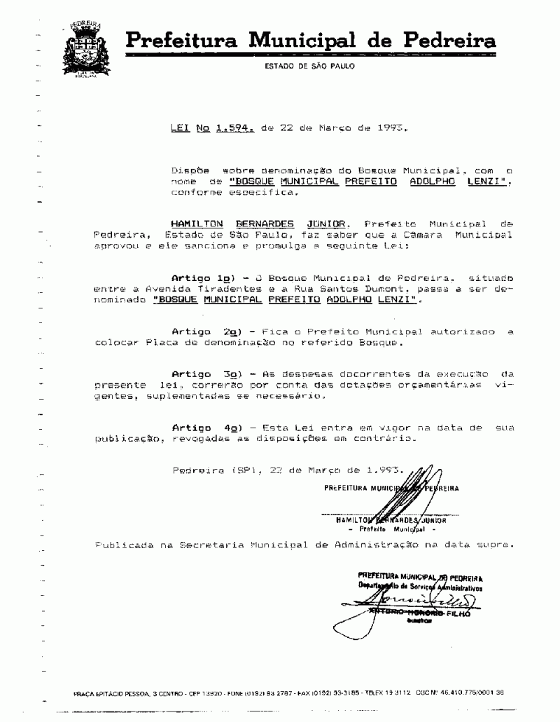 Ementa: Dispõe sobre denominação do Bosque Municipal, com o nome de "Bosque Municipal Prefeito Adolpho Lenzi", conforme especifica.