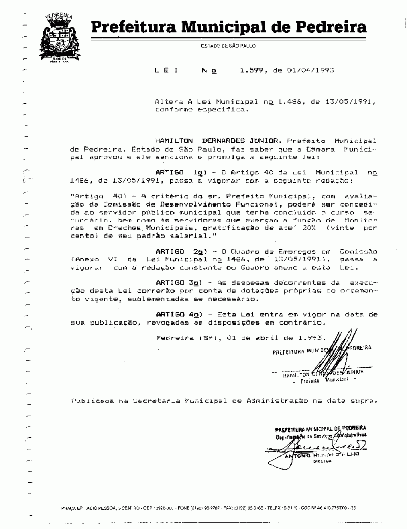 Lei Municipal - N° 1599 de 01/04/1993