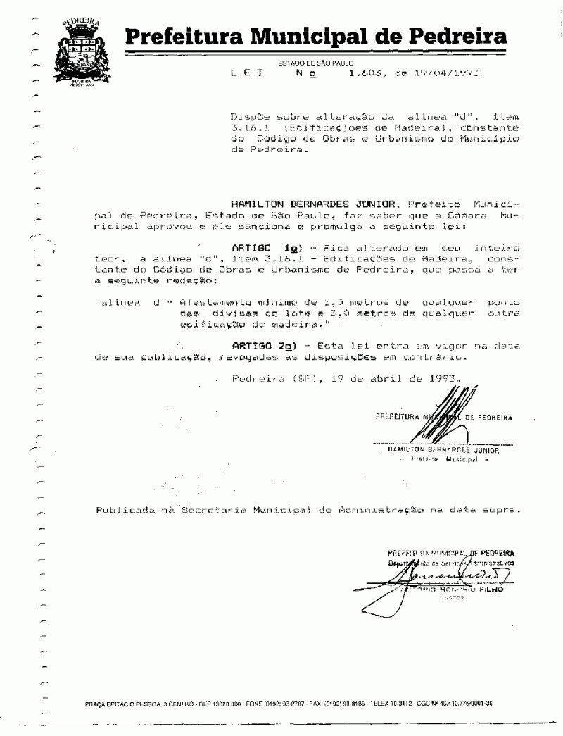 Ementa: Dispõe sobre alteração da alínea "d", item 3.16.1 (Edificações de Madeira), constante do Código de Obras e Urbanismo do Município de Pedreira.