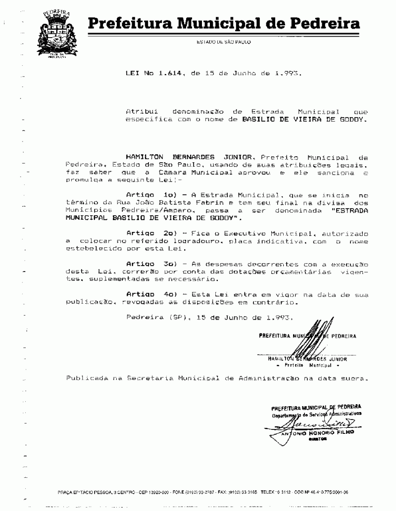 Ementa: Atribui denominação de Estrada Municipal que especifica com o nome de Basílio de Vieira de Godoy.