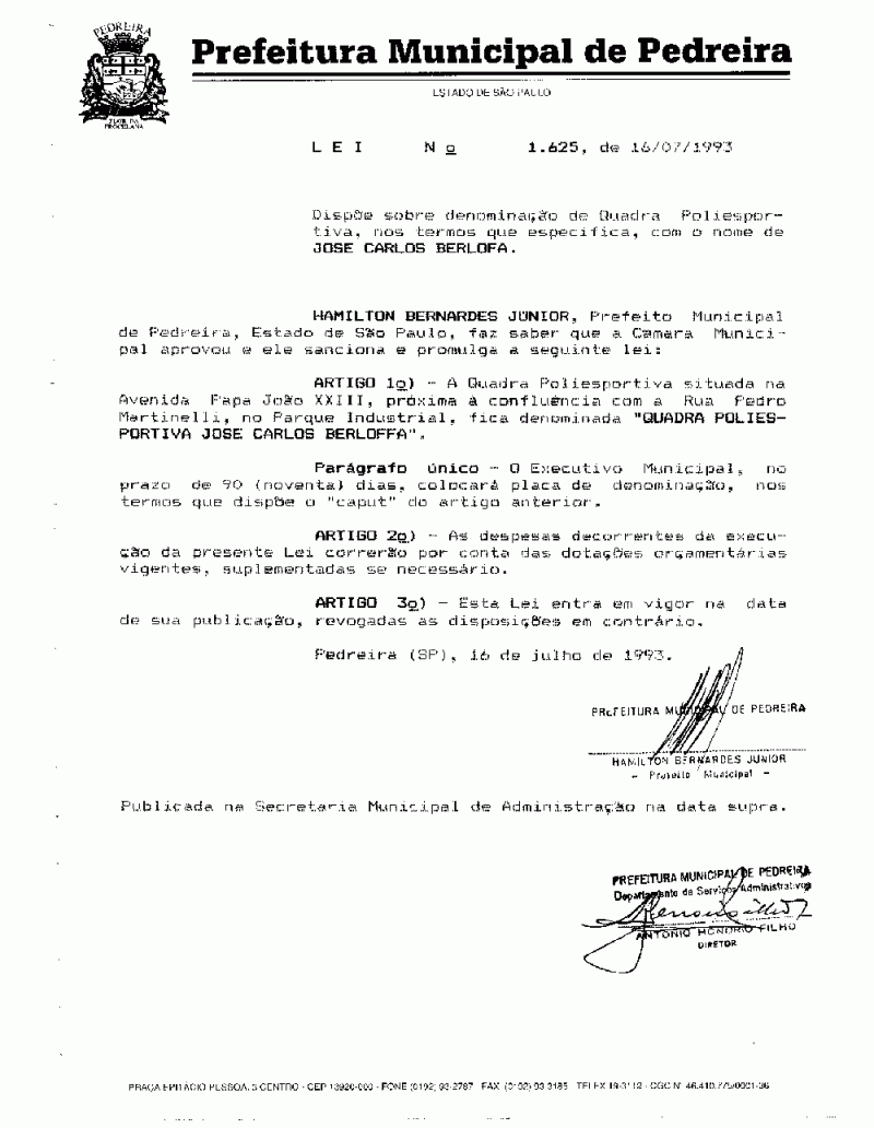 Ementa: Dispõe sobre denominação de Quadra Poliesportiva, nos termos que especifica, com o nome de José Carlos Berlofa.