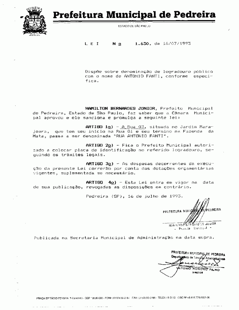 Lei Municipal - N° 1630 de 16/07/1993