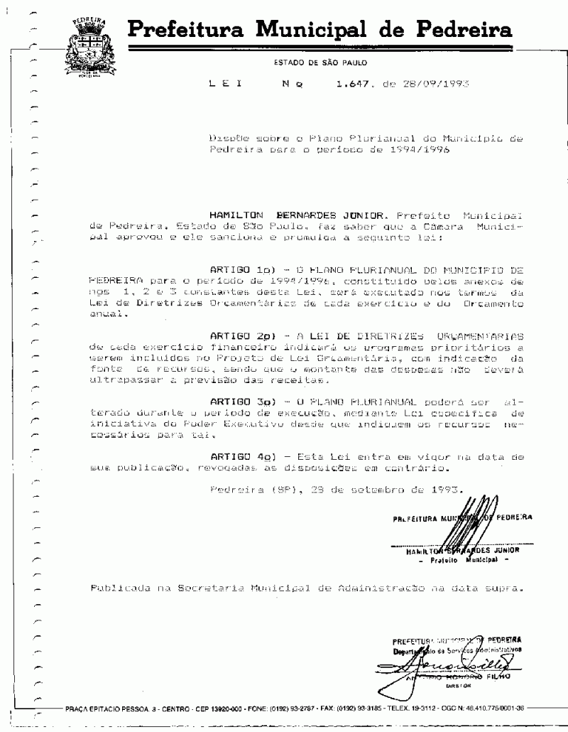 Ementa: Dispõe sobre o Plano Plurianual do Município de Pedreira para o período de 1994/1996.