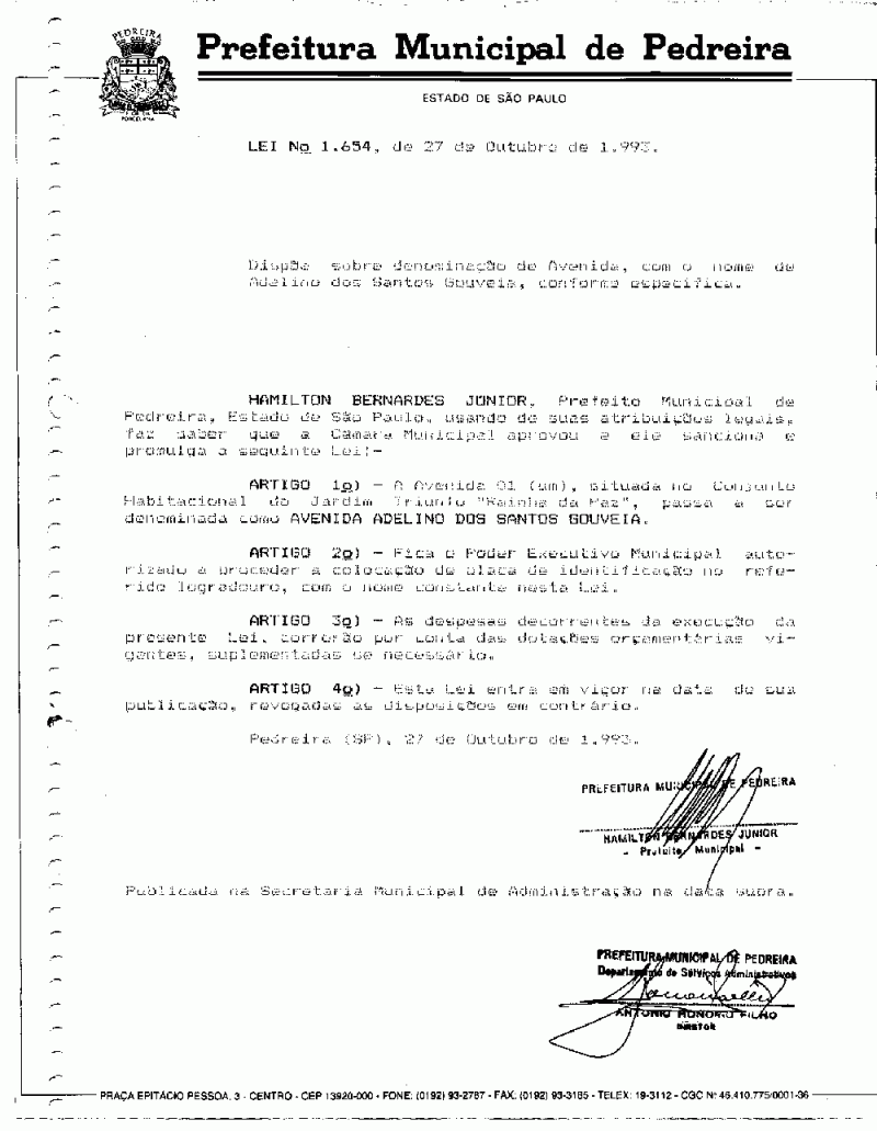 Ementa: Dispõe sobre denominação de Avenida, com o nome de Adelino dos Santos Gouveia, conforme especifica.