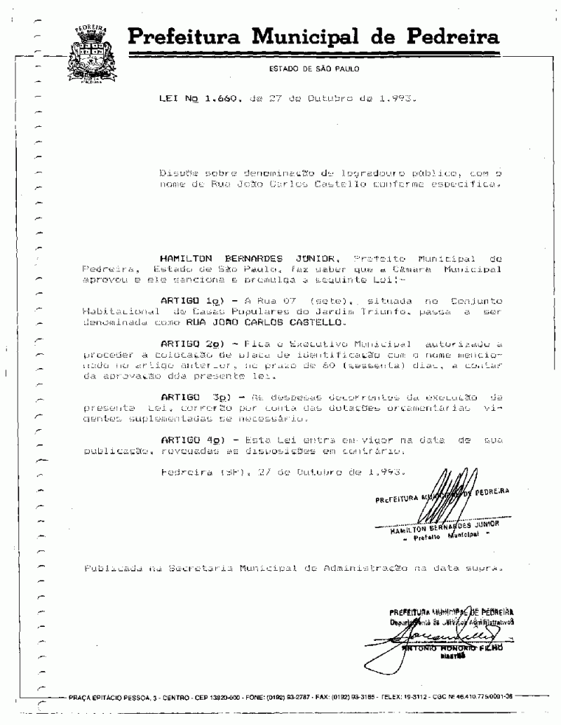 Ementa: Dispõe sobre denominação de logradouro público, com o nome de rua João Carlos Castello conforme especifica.