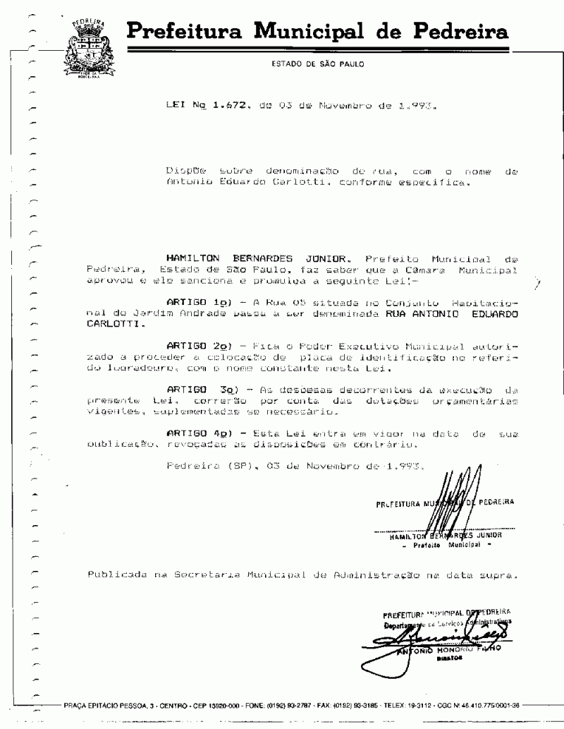 Ementa: Dispõe sobre denominação de rua, com o nome de Antonio Eduardo Carlotti, conforme especifica.