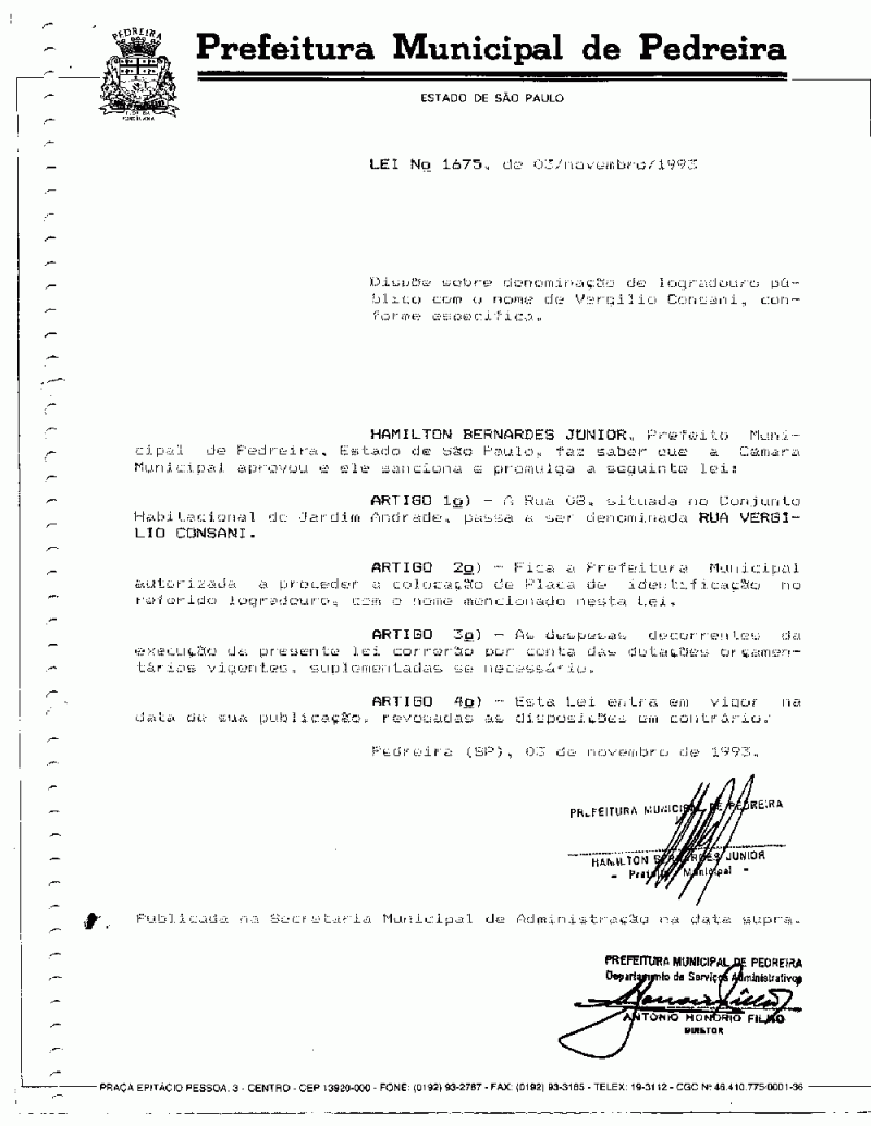 Lei Municipal - N° 1675 de 03/11/1993