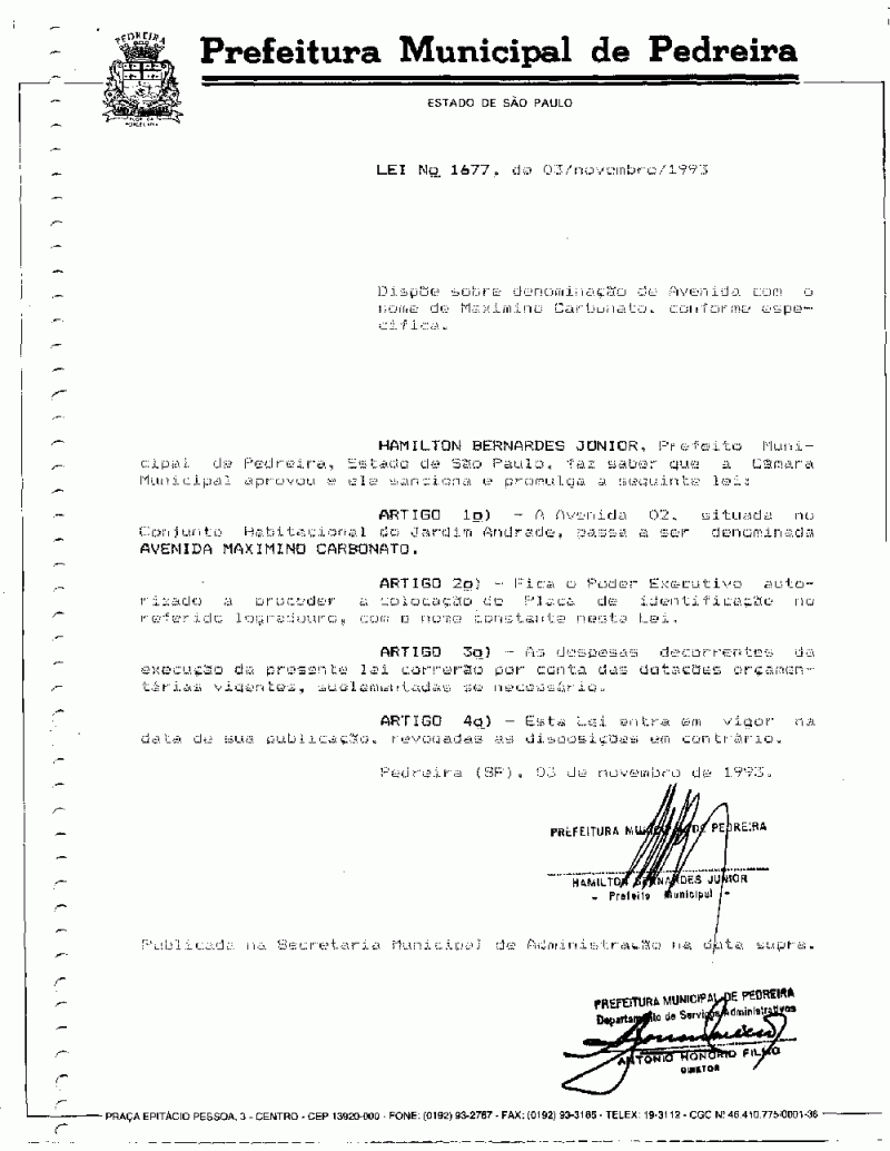 Ementa: Dispõe sobre denominação de Avenida com o nome de Maximino Carbonato, conforme especifica.