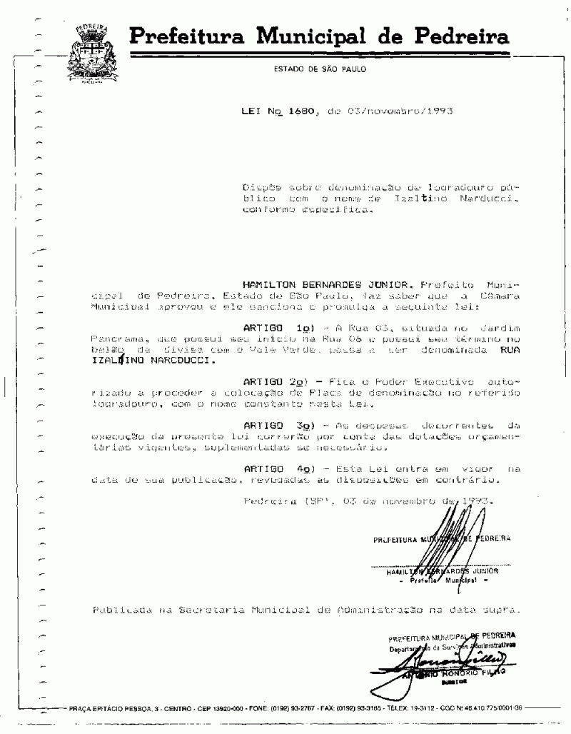 Lei Municipal - N° 1680 de 03/11/1993