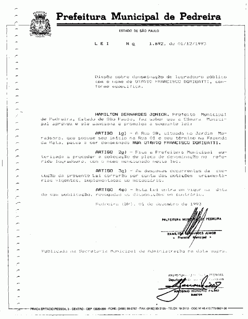 Ementa: Dispõe sobre denominação de logradouro público com o nome de Otávio Francisco Dorigatti, conforme especifica.